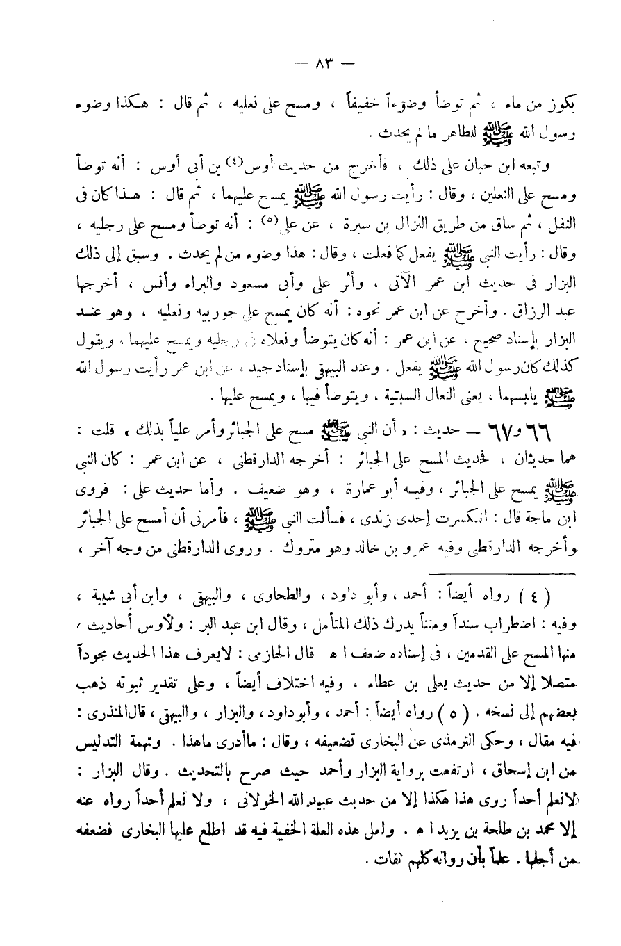 66 - و 67 حَدِيث أَن النَّبِي صَلَّى اللَّهُ عَلَيْهِ وَسَلَّم َ مسح عَلَى الجبائر وَأمر عليا بذلك قلت هما حديثان فَحَدِيث الْمسْح عَلَى الجبائر أخرجه الدَّارَقُطْنِيّ عَن ابْن عمر كَانَ النَّبِي صَلَّى اللَّهُ عَلَيْهِ وَسَلَّم َ يمسح عَلَى الجبائر وَفِيه أَبُو عمَارَة وَهُوَ ضَعِيف وَأما حَدِيث عَلّي فروَى ابْن ماجة قَالَ انْكَسَرت إِحْدَى زندي فَسَأَلت النَّبِي صَلَّى اللَّهُ عَلَيْهِ وَسَلَّم َ فَأمرنِي أَن أَمسَح عَلَى الجبائر وَأخرجه الدَّارَقُطْنِيّ وَفِيه عَمْرو بن خَالِد وَهُوَ مَتْرُوك وَرَوَى الدَّارَقُطْنِيّ من وَجه آخر