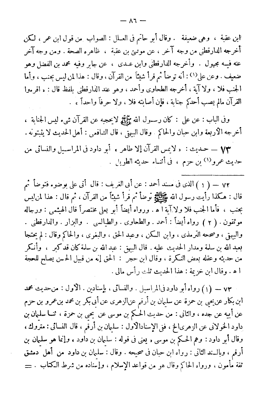 73 - حَدِيث لايمس الْقُرْآن إِلَّا طَاهِر أَبُو دَاوُد فِي الْمَرَاسِيل وَالنَّسَائِيّ من حَدِيث عَمْرو بن حزم فِي أثْنَاء حَدِيثه الطَّوِيل