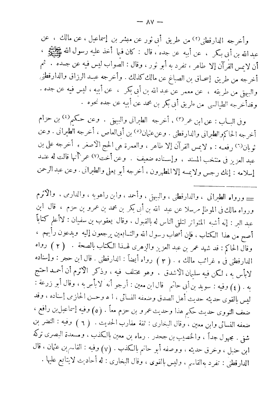 وَأخرجه الدَّارَقُطْنِيّ من طَرِيق أبي الثَّوْريّ عَن مُبشر بن إِسْمَاعِيل عَن مَالك عَن عبد الله بن أبي بكر عَن أَبِيه عَن جده قَالَ كَانَ فِيمَا أَخذ عَلَيْهِ رَسُول الله صَلَّى اللَّهُ عَلَيْهِ وَسَلَّم َ أَن لايمس الْقُرْآن إِلَّا طَاهِر تفرد بِهِ أَبُو ثَوْر وَقَالَ الصَّوَاب لَيْسَ فِيهِ عَن جده ثمَّ أخرجه من طَرِيق إِسْحَاق بن الصّباغ عَن مَالك كَذَلِك وَأخرجه عبد الرَّزَّاق وَالدَّارَقُطْنِيّ وَالْبَيْهَقِيّ من طَرِيقه عَن معمر عَن عبد الله بن أبي بكر عَن أَبِيه لَيْسَ فِيهِ عَن جده وَقد أخرجه الطَّيَالِسِيّ من طَرِيق أبي بكر بن مُحَمَّد عَن أَبِيه عَن جده نَحوه