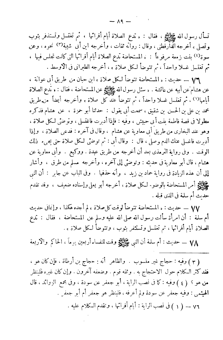 تسْأَل رَسُول الله صَلَّى اللَّهُ عَلَيْهِ وَسَلَّم َ فَقَالَ تدع الصَّلَاة أَيَّام أقرائها ثمَّ تَغْتَسِل وتستذفر بِثَوْب وَتصلي أخرجه الدَّارَقُطْنِيّ وَقَالَ رُوَاته ثِقَات وَأخرجه ابْن أبي شيبَة نَحوه وَعَن سوة بنت زَمعَة مَرْفُوعا الْمُسْتَحَاضَة تدع الصَّلَاة أَيَّام أقرائها الَّتِي كَانَت تجْلِس فِيهَا ثمَّ تَغْتَسِل غسلا وَاحِدًا ثمَّ تتوضأ لكل صَلَاة أخرجه الطَّبَرَانِيّ فِي الْأَوْسَط