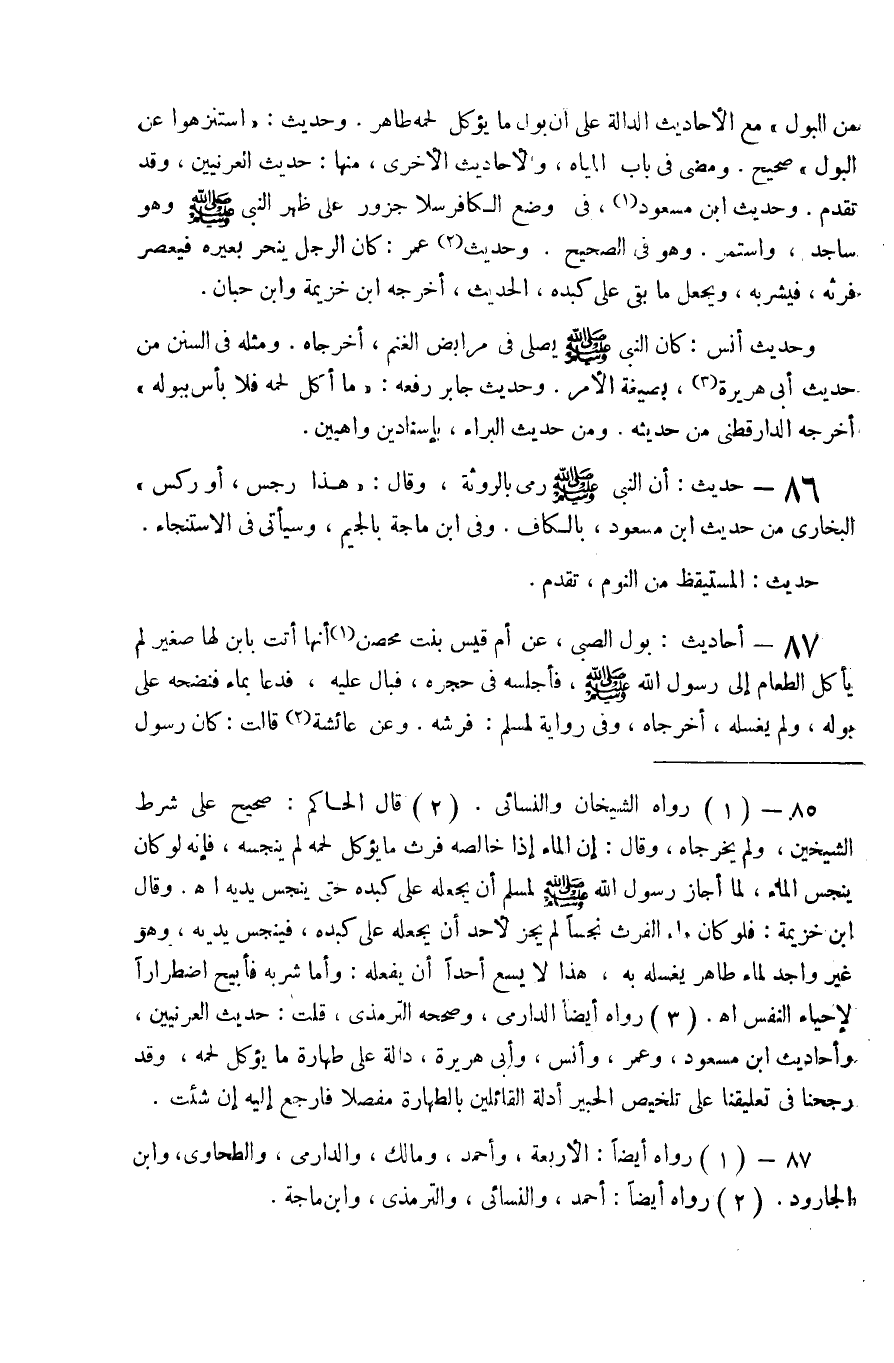 من الْبَوْل مَعَ الْأَحَادِيث الدَّالَّة عَلَى أَن بَوْل مَا يُؤْكَل لَحْمه طَاهِر وَحَدِيث استنزهوا عَن الْبَوْل صَحِيح وَمَضَى فِي بَاب الْمِيَاه وَالْأَحَادِيث الْأُخْرَى مِنْهَا حَدِيث العرنيين وَقد تقدم وَحَدِيث ابْن مَسْعُود فِي وضع الْكَافِر سلا جزور عَلَى ظهر النَّبِي صَلَّى اللَّهُ عَلَيْهِ وَسَلَّم َ وَهُوَ ساجد وَاسْتمرّ وَهُوَ فِي الصَّحِيح وَحَدِيث عمر كَانَ الرجل ينْحَر بعيره فيعصر فرثه فيشربه وَيجْعَل مَا بَقِي عَلَى كبده الحَدِيث أخرجه ابْن خُزَيْمَة وَابْن حبَان