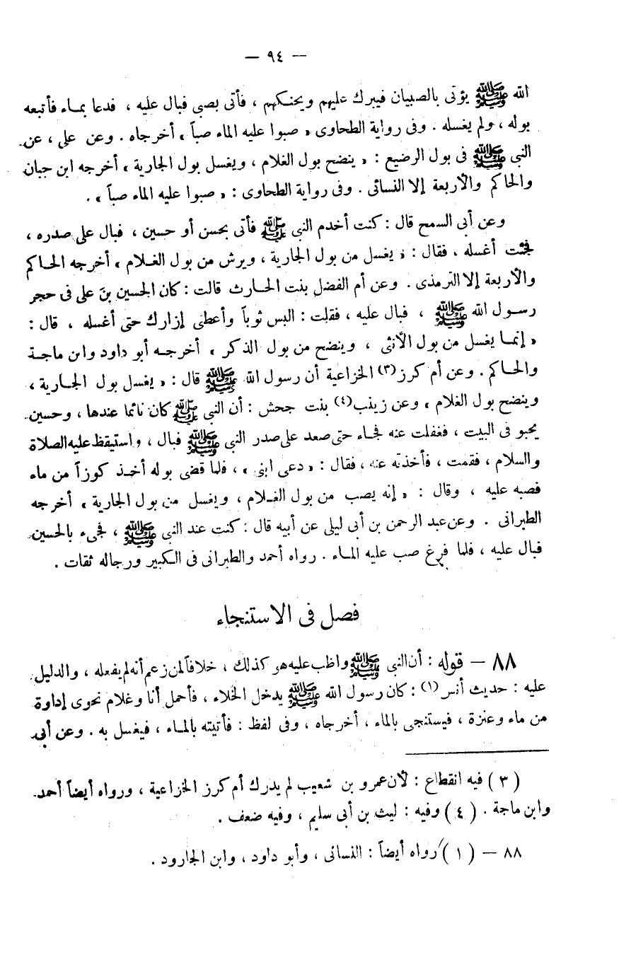الله صَلَّى اللَّهُ عَلَيْهِ وَسَلَّم َ يُؤْتِي بالصبيان فيبرك عَلَيْهِم ويحنكهم فَأَتَى بصبي فَبَال عَلَيْهِ فَدَعَا بِمَاء فَأتبعهُ بَوْله وَلم يغسلهُ وَفِي رِوَايَة الطَّحَاوِيّ صبوا عَلَيْهِ المَاء صبا أَخْرجَاهُ وَعَن عَلّي عَن النَّبِي صَلَّى اللَّهُ عَلَيْهِ وَسَلَّم َ فِي بَوْل الرَّضِيع ينضح بَوْل الْغُلَام وَيغسل بَوْل الْجَارِيَة أخرجه ابْن حبَان وَالْحَاكِم وَالْأَرْبَعَة إِلَّا النَّسَائِيّ وَفِي رِوَايَة الطَّحَاوِيّ صبوا عَلَيْهِ المَاء صبا