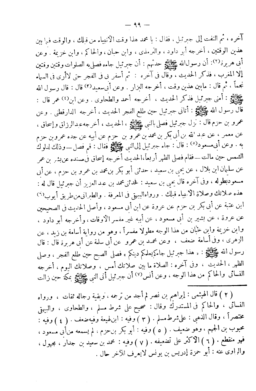 آخر ثمَّ الْتفت إِلَى جبرئيل فَقَالَ يَا مُحَمَّد هَذَا وَقت الْأَنْبِيَاء من قبلك وَالْوَقْت فِيمَا بَين هذَيْن الْوَقْتَيْنِ أخرجه أَبُو دَاوُد وَالتِّرْمِذِيّ وَابْن حبَان وَالْحَاكِم وَابْن خُزَيْمَة وَعَن أبي هُرَيْرَة أَن رَسُول الله صَلَّى اللَّهُ عَلَيْهِ وَسَلَّم َ حَدثهمْ أَن جبرئيل جَاءَهُ فَصَلى بِهِ الصَّلَوَات وَقْتَيْنِ وَقْتَيْنِ إِلَّا الْمغرب فذكرالحديث وَقَالَ فِي آخِره ثمَّ أَسْفر بِي فِي الْفجْر حَتَّى لَا أرَى فِي السَّمَاء نجما ثمَّ قَالَ مابين هذَيْن وَقت أخرجه الْبَزَّار وَعَن أبي سعيد قَالَ قَالَ رَسُول الله صَلَّى اللَّهُ عَلَيْهِ وَسَلَّم َ أمني جبرئيل فَذكر الحَدِيث أخرجه أَحْمد والطَّحَاوِي وَعَن ابْن عمر قَالَ قَالَ رَسُول الله صَلَّى اللَّهُ عَلَيْهِ وَسَلَّم َ أَتَانِي جبرئيل حِين طلع الْفجْر الحَدِيث أخرجه الدَّارَقُطْنِيّ وَعَن عَمْرو بن حزم قَالَ نزل جبرئيل فَصَلى بِالنَّبِيِّ صَلَّى اللَّهُ عَلَيْهِ وَسَلَّم َ الحَدِيث أخرجه عبد الرَّزَّاق وَإِسْحَاق عَن معمر عَن عبد الله بن أبي بكر بن مُحَمَّد بن عَمْرو بن حزم عَن أَبِيه عَن جده عَمْرو بن حزم بِهِ وَعَن أبي مَسْعُود قَالَ جَاءَ جبرئيل إِلَى النَّبِي صَلَّى اللَّهُ عَلَيْهِ وَسَلَّم َ فَقَالَ قُم فصل وَذَلِكَ لدلوك الشَّمْس حِين مَالَتْ فَقَامَ فَصَلى الظّهْر أَرْبعا الحَدِيث أخرجه إِسْحَاق فِي مُسْنده عَن بشر بن عمر عَن سُلَيْمَان ابْن بِلَال عَن يحي بن سعيد حَدثنِي أَبُو بكر بن مُحَمَّد بن عَمْرو بن حزم عَن أبي مَسْعُود بِطُولِهِ وَفِي آخِره قَالَ يحي بن سعيد فَحَدثني مُحَمَّد بن عبد الْعَزِيز أَن جبرئيل قَالَ لَهُ هَذِه صَلَاتك وَصَلَاة الْأَنْبِيَاء قبلك وَرَوَاهُ الْبَيْهَقِيّ فِي الْمعرفَة وَالطَّبَرَانِيّ من طَرِيق أَيُّوب ابْن عتبَة عَن أبي بكر بن حزم عَن عُرْوَة عَن ابْن أبي مَسْعُود وأصل الحَدِيث فِي الصَّحِيحَيْنِ عَن عُرْوَة عَن بشير بن أبي مَسْعُود عَن أَبِيه غير مُفَسّر الْأَوْقَات وَأخرجه أَبُو دَاوُد وَابْن خُزَيْمَة وَابْن حبَان من هَذَا الْوَجْه مطولا مُفَسرًا وَهُوَ من رِوَايَة أُسَامَة بن زيد عَن الزُّهْرِيّ وَفِي أُسَامَة ضعف وَعَن مُحَمَّد بن عَمْرو عَن أبي سَلمَة عَن أبي هُرَيْرَة قَالَ قَالَ رَسُول الله صَلَّى اللَّهُ عَلَيْهِ وَسَلَّم َ هَذَا جبرئيل جَاءَكُم يعلمكم دينكُمْ فَصَلى الصُّبْح حِين طلع الْفجْر وَصَلى الظّهْر الحَدِيث وَفِي آخِره الصَّلَاة مَا بَين صَلَاتك أمس وصلاتك الْيَوْم أخرجه النَّسَائِيّ وَالْحَاكِم من هَذَا الْوَجْه وَعَن أنس أَن جبرئيل أَتَى النَّبِي صَلَّى اللَّهُ عَلَيْهِ وَسَلَّم َ بِمَكَّة حِين زَالَت