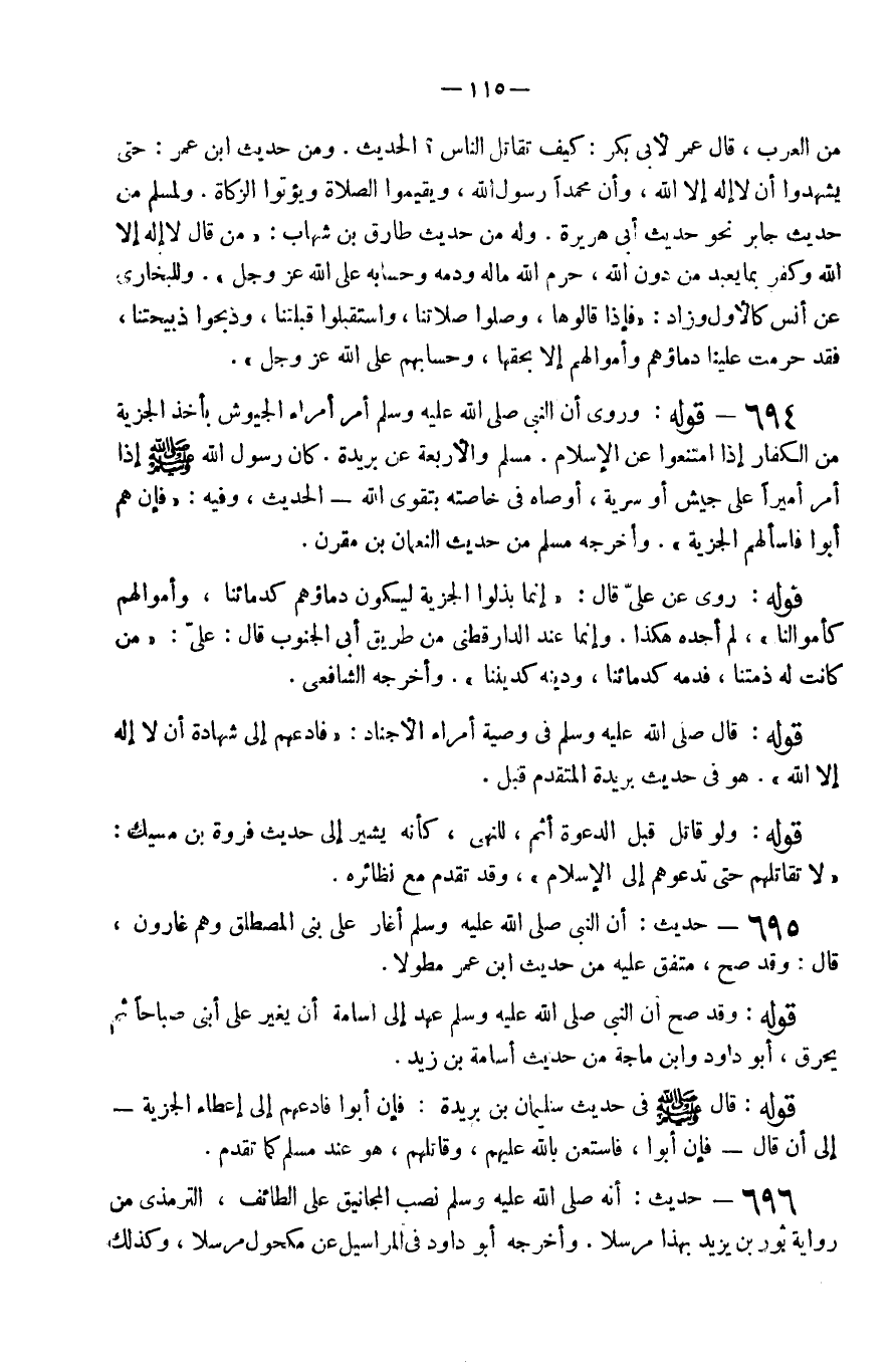 694 - قَوْله وَرَوَى أَن النَّبِي صَلَّى اللَّهُ عَلَيْهِ وَسَلَّم َ أَمر أُمَرَاء الجيوش بِأخذ الْجِزْيَة من الْكفَّار إِذا امْتَنعُوا عَن الْإِسْلَام مُسلم وَالْأَرْبَعَة عَن بُرَيْدَة كَانَ رَسُول الله صَلَّى اللَّهُ عَلَيْهِ وَسَلَّم َ إِذا أَمر أَمِيرا عَلَى جَيش أَو سَرِيَّة أَو صاه فِي خاصته بتقوى الله الحَدِيث وَفِيه فَإِن هم أَبَوا فاسألهم الْجِزْيَة وَأخرجه مُسلم من حَدِيث النُّعْمَان بن مقرن