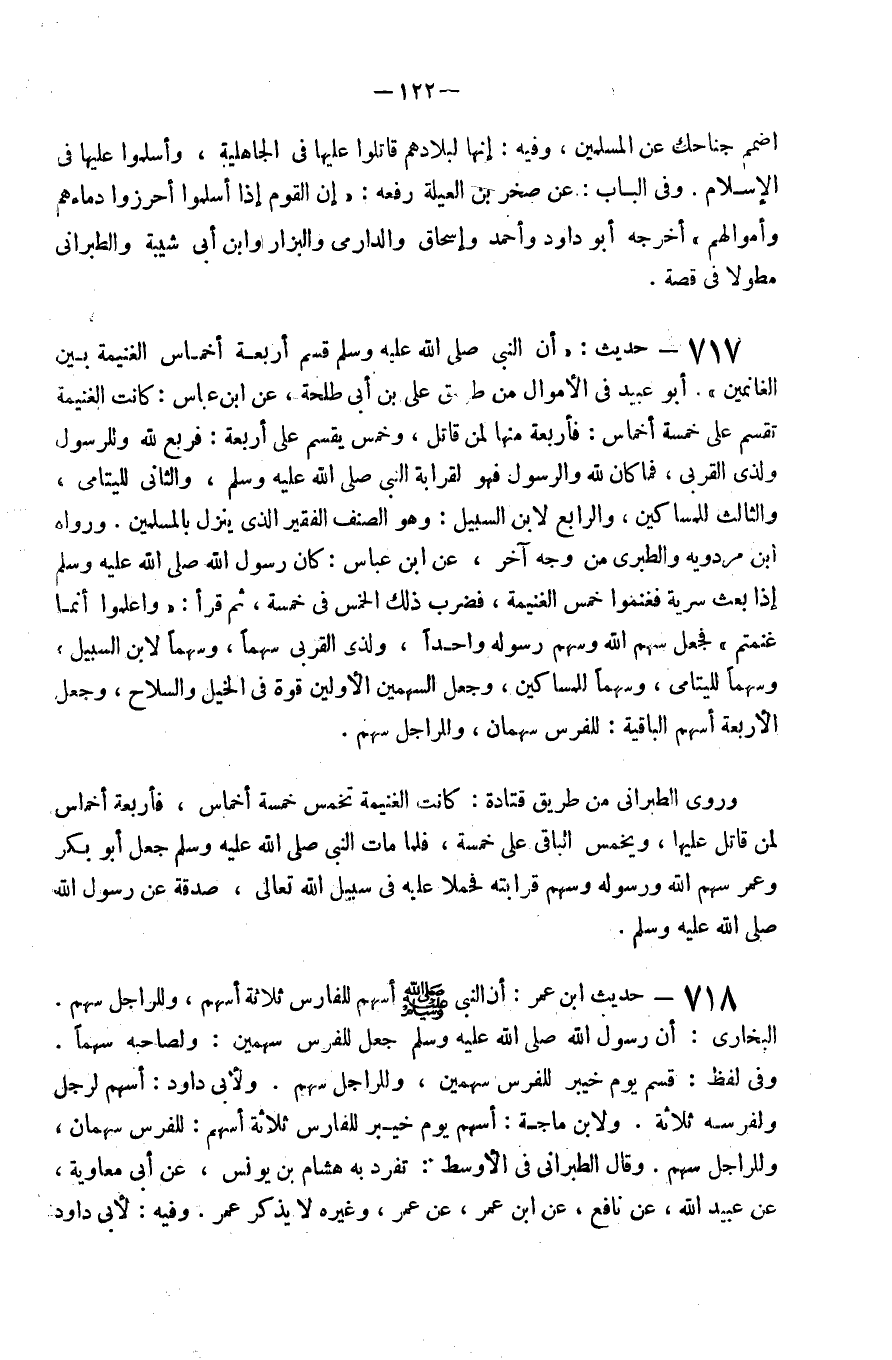 718 - حَدِيث ابْن عمر أَن النَّبِي صَلَّى اللَّهُ عَلَيْهِ وَسَلَّم َ أسْهم للفارس ثَلَاثَة أسْهم وللراجل سهم البخارى أَن رَسُول الله صَلَّى اللَّهُ عَلَيْهِ وَسَلَّم َ جعل للْفرس سَهْمَيْنِ ولصاحبه سَهْما وَفِي لفظ قسم يَوْم خَيْبَر للْفرس سَهْمَيْنِ وللراجل سهم وَلأبي دَاوُد أسْهم لرجل ولفرسه ثَلَاثَة وَلابْن ماجة أسْهم يَوْم خَيْبَر للفارس ثَلَاثَة أسْهم للْفرس سَهْمَان وللراجل سهم وَقَالَ الطبرانى فِي الْأَوْسَط تفرد بِهِ هِشَام بن يُونُس عَن أبي مُعَاوِيَة عَن عبيد الله عَن نَافِع عَن ابْن عمر عَن عمر وَغَيره لايذكر عمر وَفِيه لأبي دَاوُد