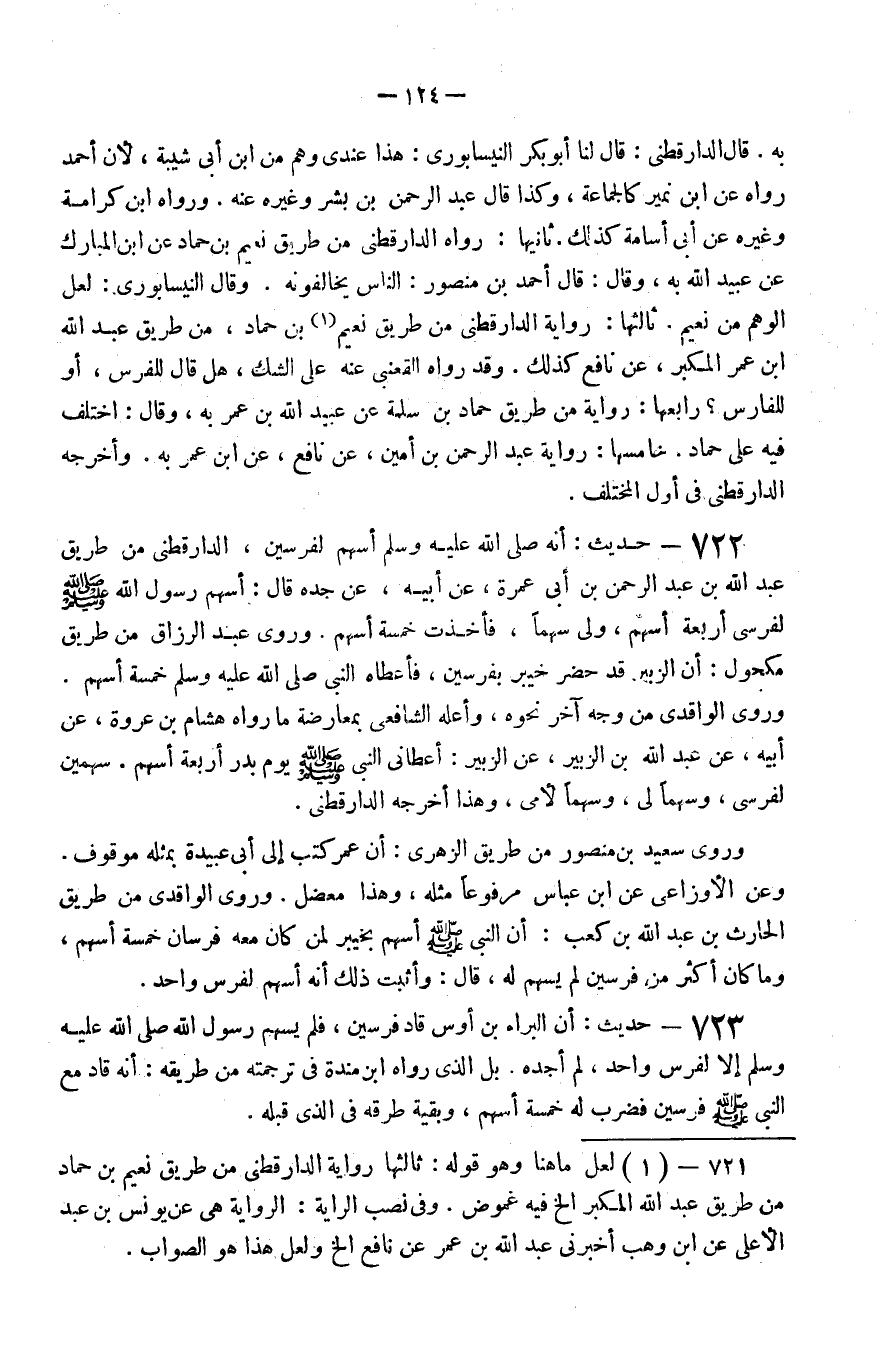 722 - حَدِيث أَنه صَلَّى اللَّهُ عَلَيْهِ وَسَلَّم َ أسْهم لفرسين الدارقطنى من طَرِيق عبد الله بن عبد الرَّحْمَن بن أبي عمْرَة عَن أَبِيه عَن جده قَالَ أسْهم رَسُول الله صَلَّى اللَّهُ عَلَيْهِ وَسَلَّم َ لفرسى أَرْبَعَة أسْهم وَلَّى سَهْما فَأخذت خَمْسَة أسْهم وَرَوَى عبد الرَّزَّاق من طَرِيق مَكْحُول أَن الزبير قد حضر خَيْبَر بفرسين فَأعْطَاهُ النَّبِي صَلَّى اللَّهُ عَلَيْهِ وَسَلَّم َ خَمْسَة أسْهم وَرَوَى الواقدى من وَجه آخر نَحوه وَأعله الشَّافِعِي بمعارضة مَا رَوَاهُ هِشَام بن عُرْوَة عَن أَبِيه عَن عبد الله بن الزبير عَن الزبير أعطانى النَّبِي صَلَّى اللَّهُ عَلَيْهِ وَسَلَّم َ يَوْم بدر أَرْبَعَة أسْهم سَهْمَيْنِ لفرسى وَسَهْما لى وَسَهْما لأمى وَهَذَا أخرجه الدارقطنى