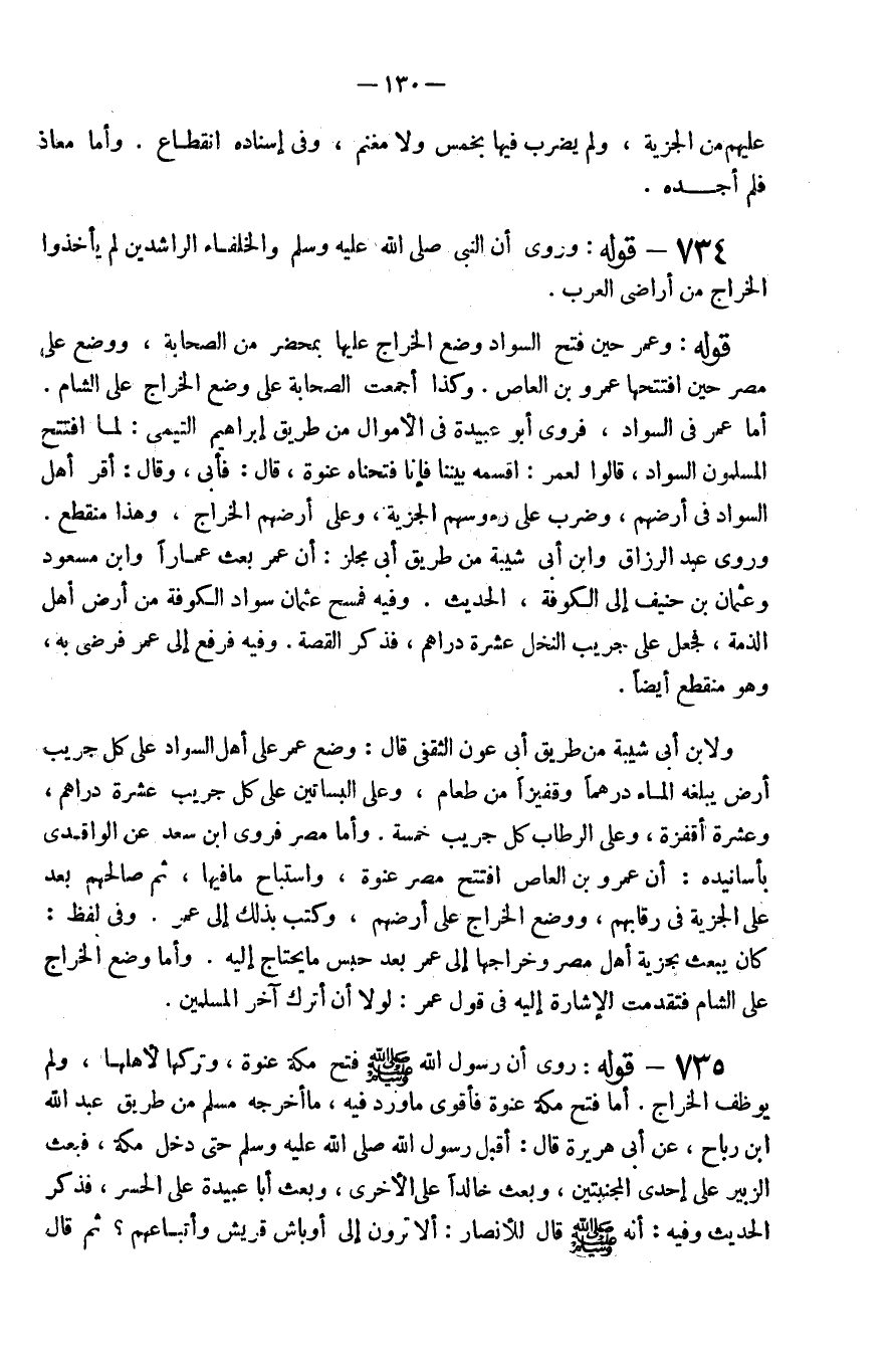 734 - قَوْله وَرَوَى أَن النَّبِي صَلَّى اللَّهُ عَلَيْهِ وَسَلَّم َ وَالْخُلَفَاء الرَّاشِدين لم يَأْخُذُوا الْخراج من أَرَاضِي الْعَرَب