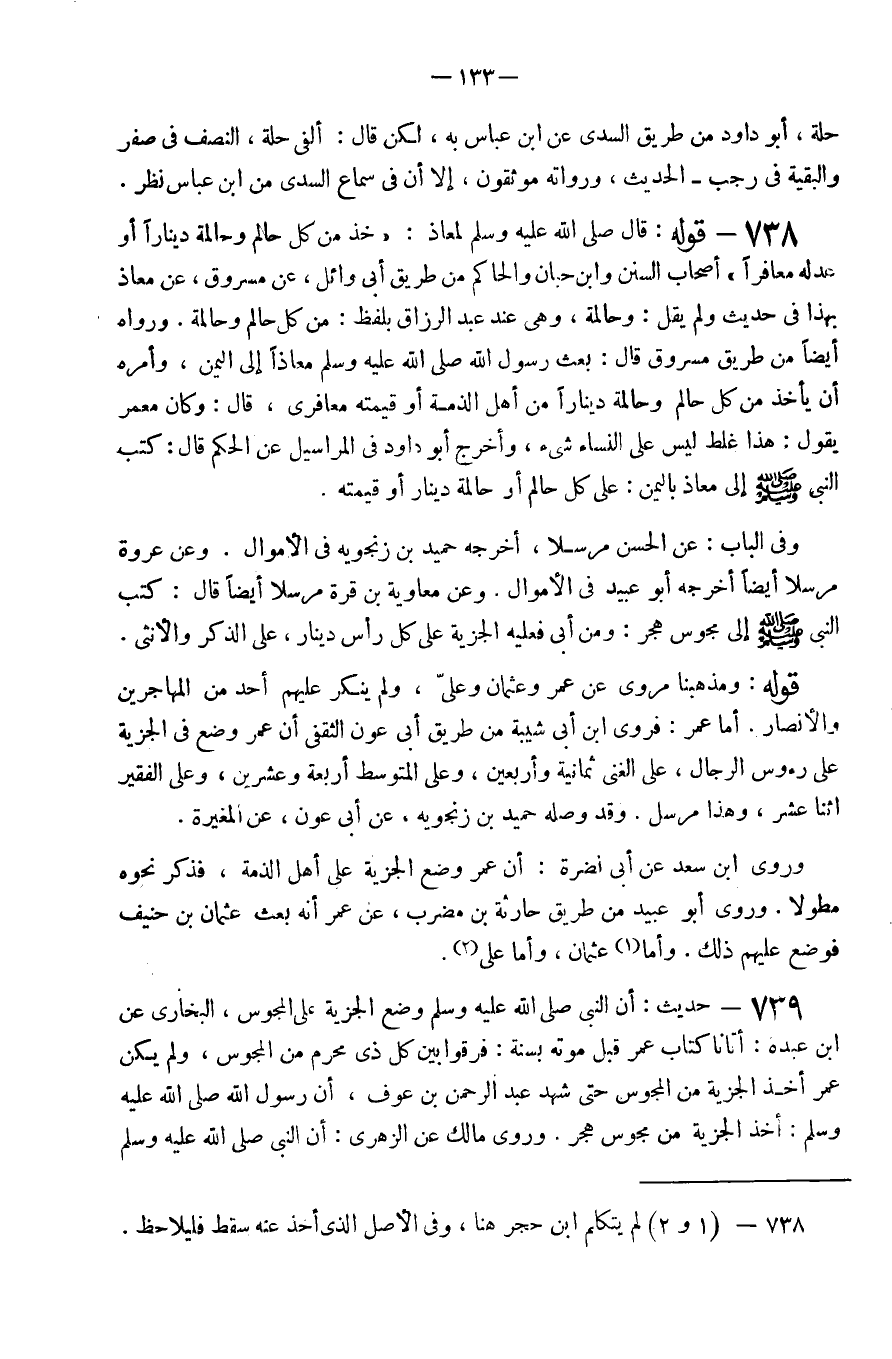 739 - حَدِيث أَن النَّبِي صَلَّى اللَّهُ عَلَيْهِ وَسَلَّم َ وضع الْجِزْيَة عَلَى الْمَجُوس البُخَارِيّ عَن ابْن عَبدة أَتَانَا كتاب عمر قبل مَوته بِسنة فرقوا بَين كل ذِي محرم من الْمَجُوس وَلم يكن عمر أَخذ الْجِزْيَة من الْمَجُوس حَتَّى شهد عبد الرَّحْمَن بن عَوْف أَن رَسُول الله صَلَّى اللَّهُ عَلَيْهِ وَسَلَّم َ أَخذ الْجِزْيَة من مجوس هجر وَرَوَى مَالك عَن الزُّهْرِيّ أَن النَّبِي صَلَّى اللَّهُ عَلَيْهِ وَسَلَّم َ