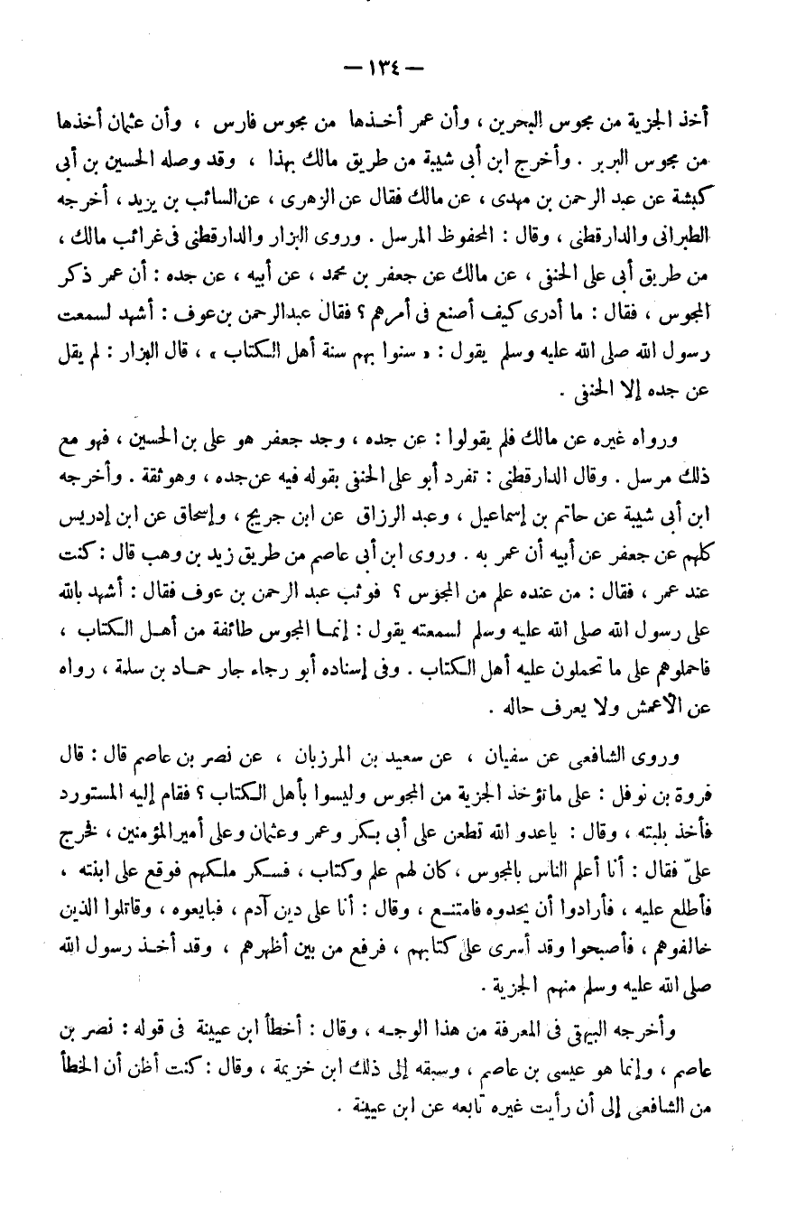 وَرَوَى الشَّافِعِي عَن سُفْيَان عَن سعيد بن الْمَرْزُبَان عَن نصر بن عَاصِم قَالَ قَالَ فَرْوَة بن نَوْفَل عَلَى مَا تُؤْخَذ الْجِزْيَة من الْمَجُوس وَلَيْسوا بِأَهْل الْكتاب فَقَامَ إِلَيْهِ الْمُسْتَوْرد فَأخذ بلبته وَقَالَ يَا عَدو الله تطعن عَلَى أبي بكر وَعمر وَعُثْمَان وَعلي أَمِير الْمُؤمنِينَ فَخرج عَلّي فَقَالَ أَنا أعلم النَّاس بالمجوس كَانَ لَهُم علم وَكتاب فَسَكِرَ ملكهم فَوَقع عَلَى ابْنَته فَأطلع عَلَيْهِ فأرادوا أَن يحدوه فَامْتنعَ وَقَالَ أَنا عَلَى دين آدم فَبَايعُوهُ وقاتلوا الَّذين خالفوهم فَأَصْبحُوا وَقد أَسْرَى عَلَى كِتَابهمْ فَرفع من بَين أظهرهم وَقد أَخذ رَسُول الله صَلَّى اللَّهُ عَلَيْهِ وَسَلَّم َ مِنْهُم الْجِزْيَة