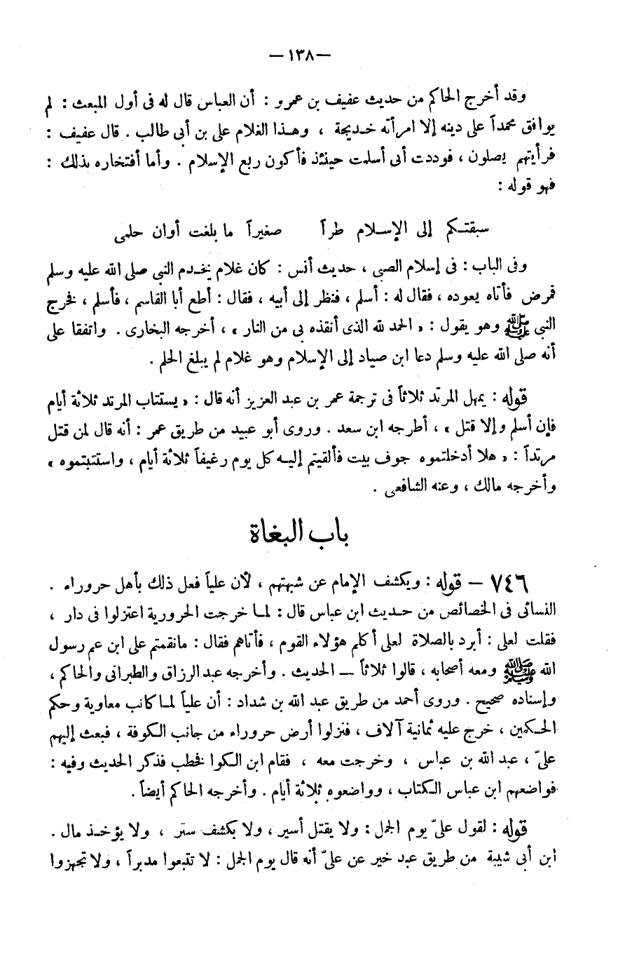 746 - قَوْله ويكشف الإِمَام عَن شبهتهم لِأَن عليا فعل ذَلِك بِأَهْل حروراء النَّسَائِيّ فِي الخصائص من حَدِيث ابْن عَبَّاس قَالَ لما خرجت الحرورية اعتزلوا فِي دَار فَقلت لعَلي أبرد بِالصَّلَاةِ لعَلي أكلم هَؤُلَاءِ الْقَوْم فَأَتَاهُم فَقَالَ مانقمتم عَلَى ابْن عَم رَسُول الله صَلَّى اللَّهُ عَلَيْهِ وَسَلَّم َ وَمَعَهُ أَصْحَابه قَالُوا ثَلَاثًا الحَدِيث وَأخرجه عبد الرَّزَّاق وَالطَّبَرَانِيّ وَالْحَاكِم وَإِسْنَاده صَحِيح وَرَوَى أَحْمد من طَرِيق عبد الله بن شَدَّاد أَن عليا لما كَاتب مُعَاوِيَة وَحكم الْحكمَيْنِ خرج عَلَيْهِ ثَمَانِيَة آلَاف فنزلوا أَرض حروراء من جَانب الْكُوفَة فَبعث إِلَيْهِم عَلّي عبد الله بن عَبَّاس وَخرجت مَعَه فَقَامَ ابْن الكوا فَخَطب فَذكر الحَدِيث وَفِيه فواضعهم ابْن عَبَّاس الْكتاب وواضعوه ثَلَاثَة أَيَّام وَأخرجه الْحَاكِم أَيْضا