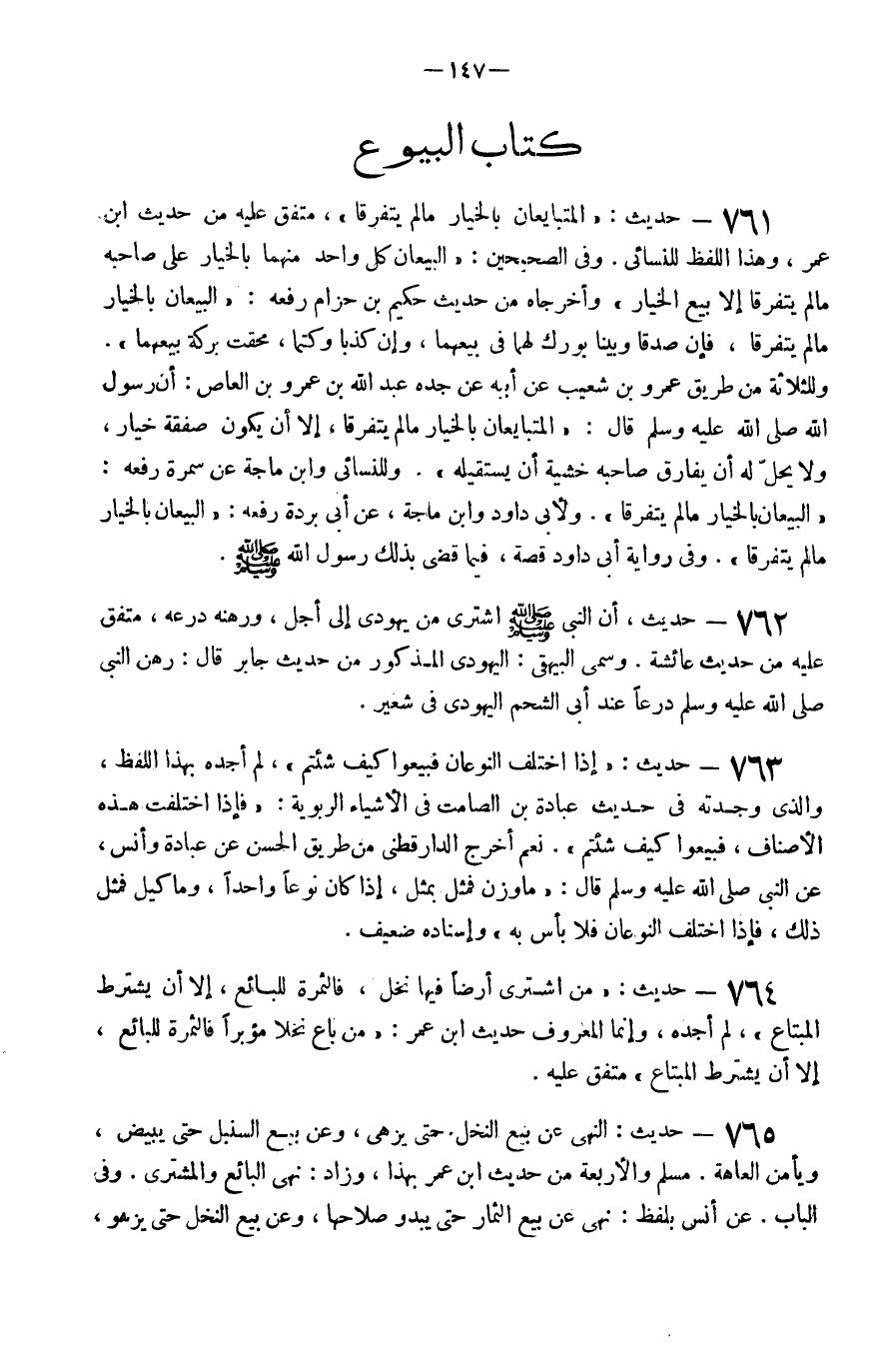 761 - حَدِيث الْمُتَبَايعَانِ بِالْخِيَارِ مالم يَتَفَرَّقَا مُتَّفق عَلَيْهِ من حَدِيث ابْن عمر وَهَذَا اللَّفْظ للنسائي وَفِي الصَّحِيحَيْنِ البيعان كل وَاحِد مِنْهُمَا بِالْخِيَارِ عَلَى صَاحبه مالم يَتَفَرَّقَا إِلَّا بيع الْخِيَار وَأَخْرَجَاهُ من حَدِيث حَكِيم بن حزَام رَفعه البيعان بِالْخِيَارِ مالم يَتَفَرَّقَا فَإِن صدقا وَبينا بورك لَهما فِي بيعهمَا وَإِن كذبا وكتما محقت بركَة بيعهمَا وللثلاثة من طَرِيق عَمْرو بن شُعَيْب عَن أَبِيه عَن جده عبد الله بن عَمْرو بن الْعَاصِ أَن رَسُول الله صَلَّى اللَّهُ عَلَيْهِ وَسَلَّم َ قَالَ الْمُتَبَايعَانِ بِالْخِيَارِ مالم يَتَفَرَّقَا إِلَّا أَن يكون صَفْقَة خِيَار وَلَا يحل لَهُ أَن يُفَارق صَاحبه خشيَة أَن يستقيله وللنسائي وَابْن ماجة عَن سَمُرَة رَفعه البيعان بِالْخِيَارِ مالم يَتَفَرَّقَا وَلأبي دَاوُد وَابْن ماجة عَن أبي بردة رَفعه البيعان بِالْخِيَارِ مَا لم يَتَفَرَّقَا وَفِي رِوَايَة أبي دَاوُد قصَّة فِيمَا قَضَى بذلك رَسُول الله صَلَّى اللَّهُ عَلَيْهِ وَسَلَّم َ