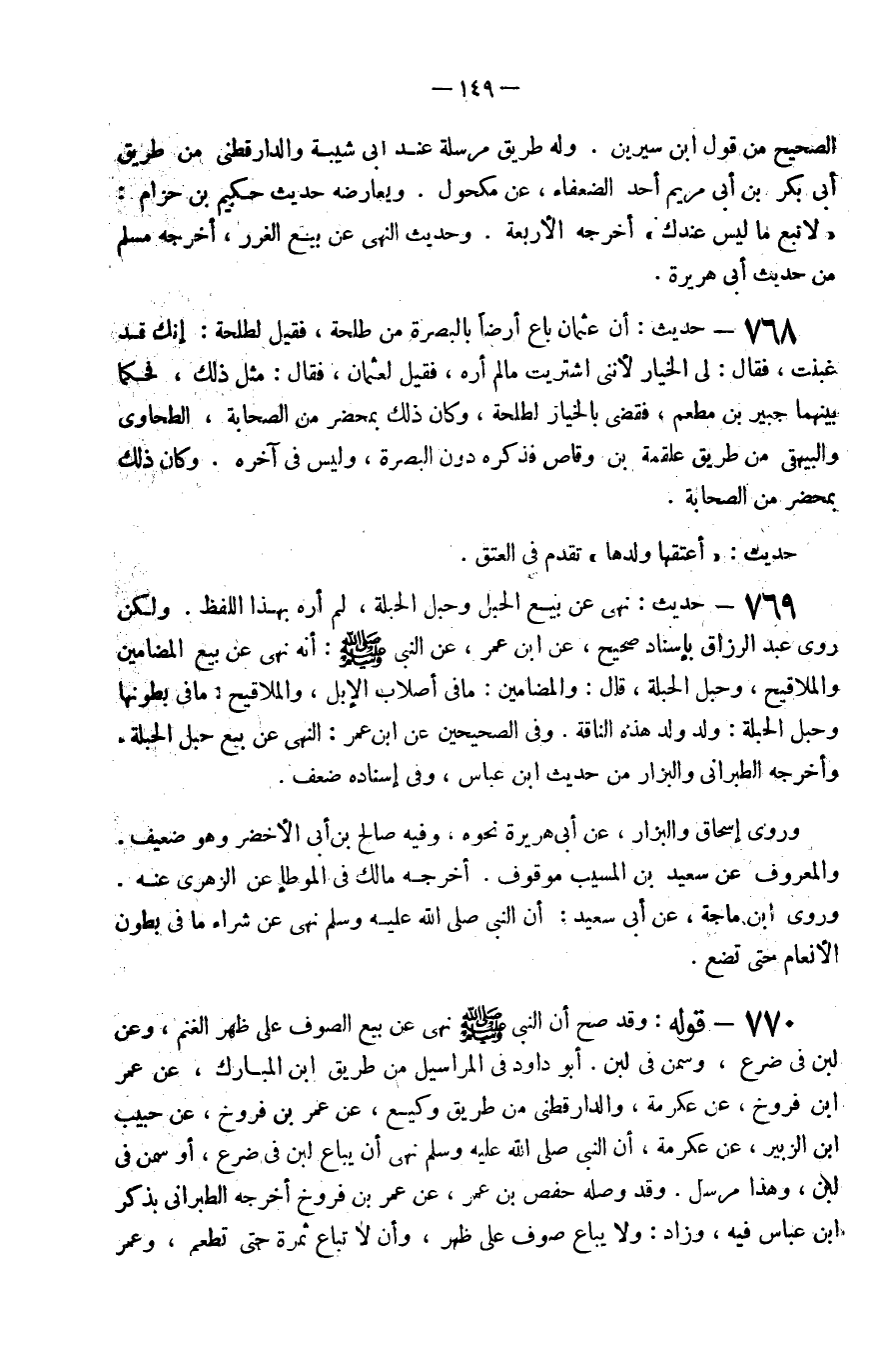 769 - حَدِيث نهَى عَن بيع الْحَبل وحبل الحبلة لم أره بِهَذَا اللَّفْظ وَلَكِن رَوَى عبد الرَّزَّاق بِإِسْنَاد صَحِيح عَن ابْن عمر عَن النَّبِي صَلَّى اللَّهُ عَلَيْهِ وَسَلَّم َ أَنه نهَى عَن بيع المضامين والملاقيح وحبل الحبلة قَالَ والمضامين مَا فِي أصلاب الْإِبِل والملاقيح مَا فِي بطونها وحبل الحبلة ولد ولد هَذِه النَّاقة وَفِي الصَّحِيحَيْنِ عَن ابْن عمر النَّهْي عَن بيع حَبل الحبلة وَأخرجه الطَّبَرَانِيّ وَالْبَزَّار من حَدِيث ابْن عَبَّاس وَفِي إِسْنَاده ضعف