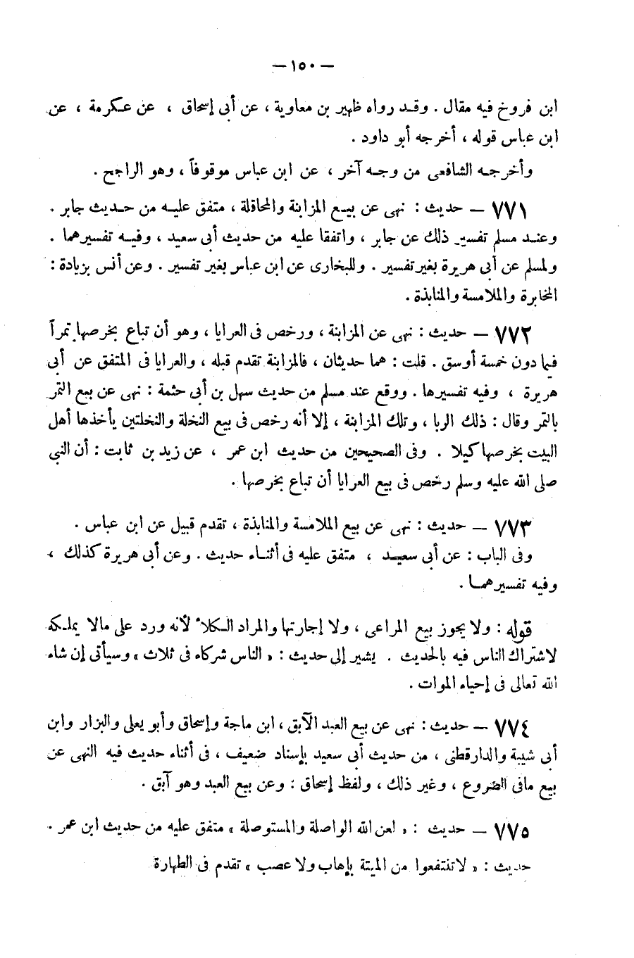 771 - حَدِيث نهَى عَن بيع الْمُزَابَنَة والمحاقلة مُتَّفق عَلَيْهِ من حَدِيث جَابر وَعند مُسلم تَفْسِير ذَلِك عَن جَابر واتفقا عَلَيْهِ من حَدِيث أبي سعيد وَفِيه تفسيرهما وَلمُسلم عَن أبي هُرَيْرَة بِغَيْر تَفْسِير وللبخاري عَن ابْن عَبَّاس بِغَيْر تَفْسِير وَعَن أنس بِزِيَادَة المخابرة وَالْمُلَامَسَة والمنابذة