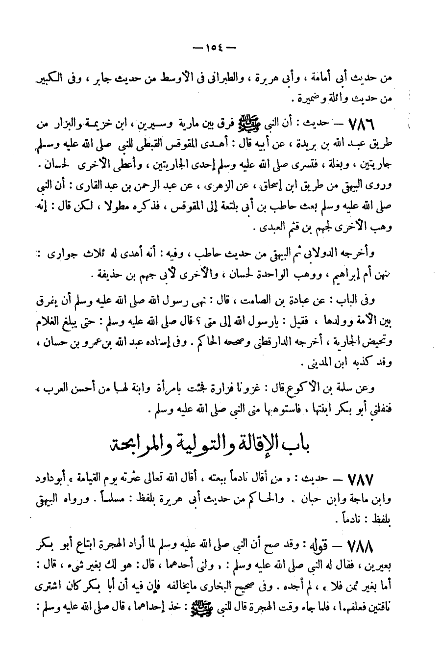 786 - حَدِيث أَن النَّبِي صَلَّى اللَّهُ عَلَيْهِ وَسَلَّم َ فرق بَين مَارِيَة وَسِيرِين ابْن خُزَيْمَة وَالْبَزَّار من طَرِيق عبد الله بن بُرَيْدَة عَن أَبِيه قَالَ أهْدَى الْمُقَوْقس القبطي للنَّبِي صَلَّى اللَّهُ عَلَيْهِ وَسَلَّم َ جاريتين وَبغلة فتسري صَلَّى اللَّهُ عَلَيْهِ وَسَلَّم َ إِحْدَى الجاريتين وَأعْطَى الْأُخْرَى لحسان وَرَوَى الْبَيْهَقِيّ من طَرِيق ابْن إِسْحَاق عَن الزُّهْرِيّ عَن عبد الرَّحْمَن بن عبد الْقَارِي أَن النَّبِي صَلَّى اللَّهُ عَلَيْهِ وَسَلَّم َ بعث حَاطِب بن أبي بلتعة إِلَى الْمُقَوْقس فَذكره مطولا لَكِن قَالَ إِنَّه وهب الْأُخْرَى لجهم بن قثم الْعَبْدي