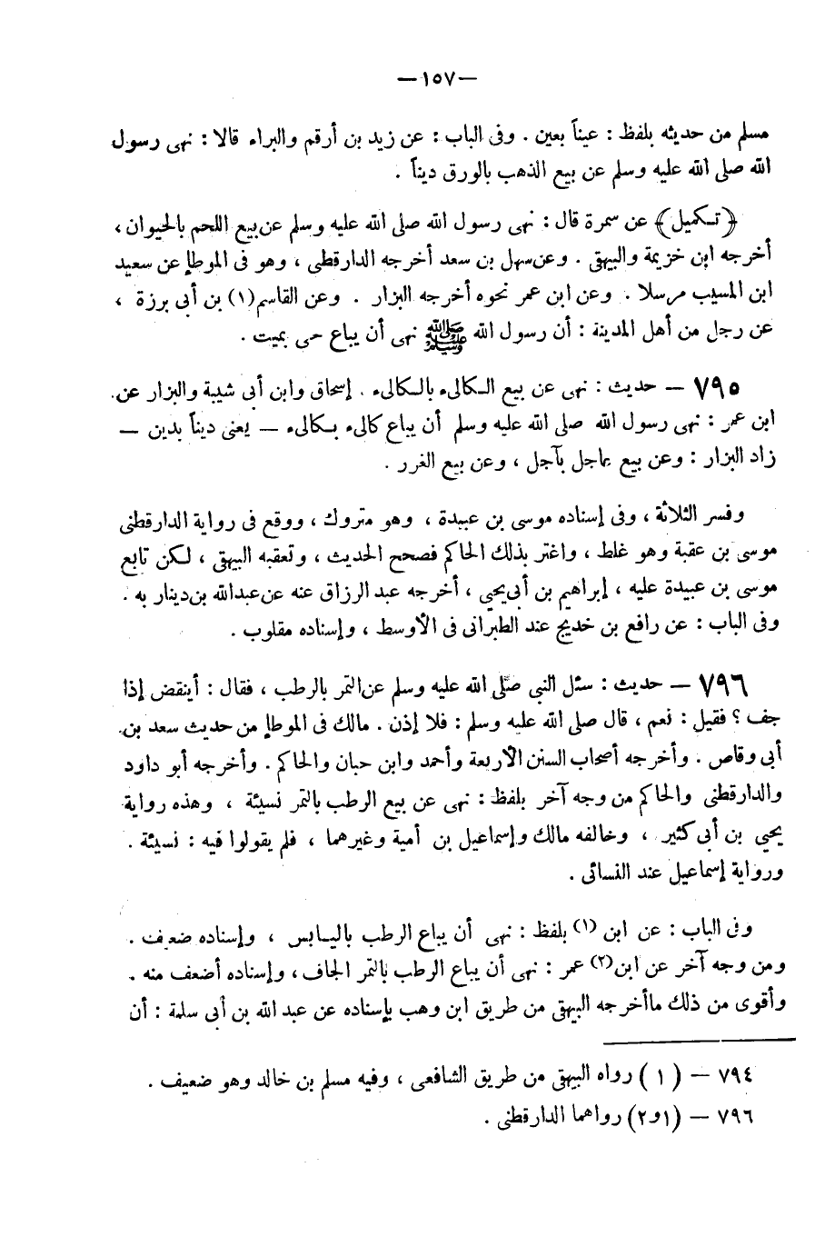 796 - حَدِيث سُئِلَ النَّبِي صَلَّى اللَّهُ عَلَيْهِ وَسَلَّم َ عَن التَّمْر بالرطب فَقَالَ أينقض إِذا جف فَقيل نعم قَالَ صَلَّى اللَّهُ عَلَيْهِ وَسَلَّم َ فَلَا إِذن مَالك فِي الْمُوَطَّإِ من حَدِيث سعد بن أبي وَقاص وَأخرجه أَصْحَاب السّنَن الْأَرْبَعَة وَأحمد وَابْن حبَان وَالْحَاكِم وَأخرجه أَبُو دَاوُد وَالدَّارقطني وَالْحَاكِم من وَجه آخر بِلَفْظ نهَى عَن بيع الرطب بِالتَّمْرِ نَسِيئَة وَهَذِه رِوَايَة يَحْيَى بن أبي كثير وَخَالفهُ مَالك وَإِسْمَاعِيل بن أُميَّة وَغَيرهمَا فَلم يَقُولُوا فِيهِ نَسِيئَة وَرِوَايَة إِسْمَاعِيل عِنْد النَّسَائِيّ
