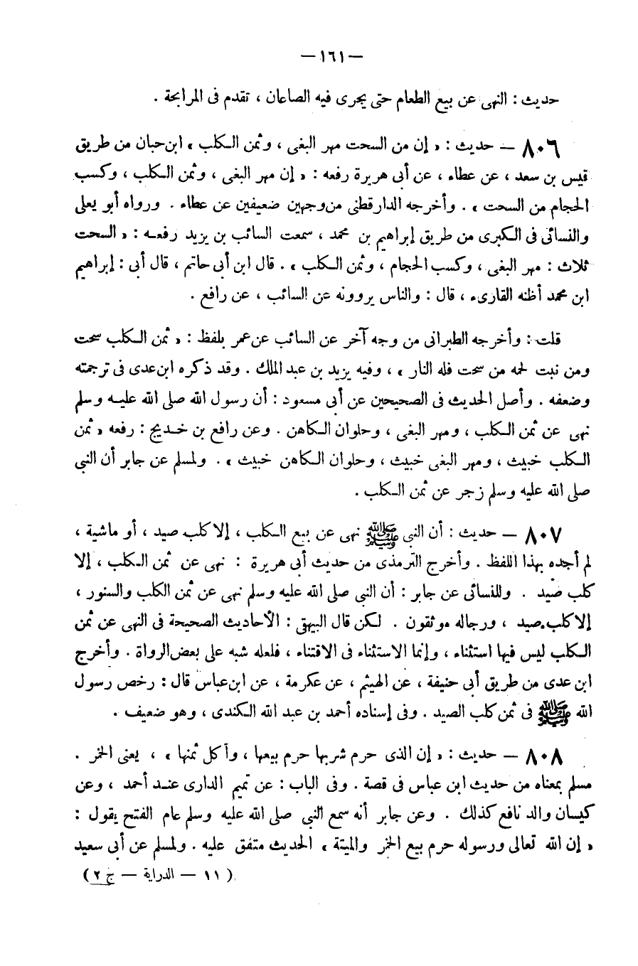 807 - حَدِيث أَن النَّبِي صَلَّى اللَّهُ عَلَيْهِ وَسَلَّم َ نهَى عَن بيع الْكَلْب إِلَّا كلب صيد أَو مَاشِيَة لم أَجِدهُ بِهَذَا اللَّفْظ وَأخرج التِّرْمِذِيّ من حَدِيث أبي هُرَيْرَة نهَى عَن ثمن الْكَلْب إِلَّا كلب صيد وللنسائي عَن جَابر أَن النَّبِي صَلَّى اللَّهُ عَلَيْهِ وَسَلَّم َ نهَى عَن ثمن الْكَلْب والسنور إِلَّا كلب صيد وَرِجَاله موثقون لَكِن قَالَ الْبَيْهَقِيّ الْأَحَادِيث الصَّحِيحَة فِي النَّهْي عَن ثمن الْكَلْب لَيْسَ فِيهَا اسْتثِْنَاء وَإِنَّمَا الِاسْتِثْنَاء فِي الاقتناء فَلَعَلَّهُ شبه عَلَى بعض الروَاة وَأخرج ابْن عدي من طَرِيق أبي حنيفَة عَن الْهَيْثَم عَن عِكْرِمَة عَن ابْن عَبَّاس قَالَ رخص رَسُول الله صَلَّى اللَّهُ عَلَيْهِ وَسَلَّم َ فِي ثمن كلب الصَّيْد وَفِي إِسْنَاده أَحْمد بن عبد الله الْكِنْدِيّ وَهُوَ ضَعِيف