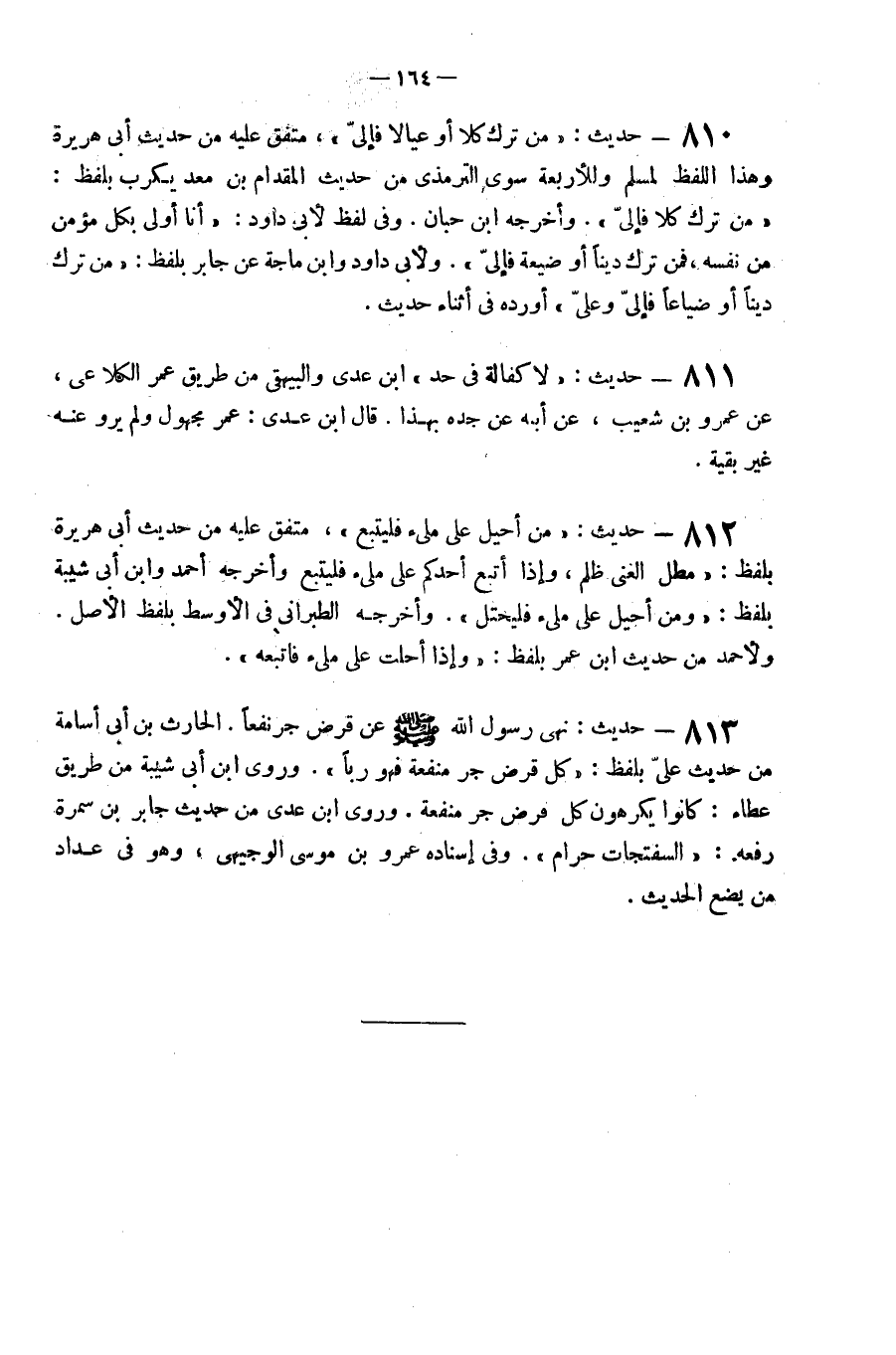 810 - حَدِيث من ترك كلا أَو عيالا فَإلَى مُتَّفق عَلَيْهِ من حَدِيث أبي هُرَيْرَة وَهَذَا اللَّفْظ لمُسلم وللأربعة سُوَى التِّرْمِذِيّ من حَدِيث الْمِقْدَام بن معد يكرب بِلَفْظ من ترك كلا فَإلَى وَأخرجه ابْن حبَان وَفِي لفظ لأبي دَاوُد أَنا أولَى بِكُل مُؤمن من نَفسه فَمن ترك دينا أَو ضيعه فَإلَى وَلأبي دَاوُد وَابْن ماجة عَن جَابر بِلَفْظ من ترك دينا أَو ضيَاعًا فَإلَى وَعَلَى أوردهُ فِي أثْنَاء حَدِيث