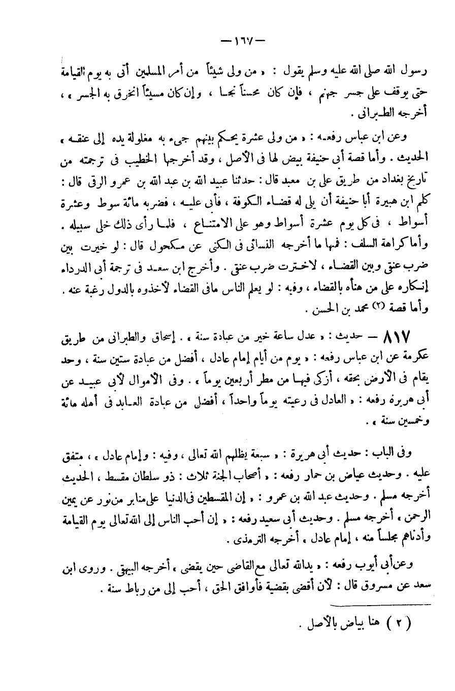 وَعَن ابْن عَبَّاس رَفعه من وَلَّى عشرَة يحكم بَينهم جِيءَ بِهِ مغلولة يَده إِلَى عُنُقه الحَدِيث وَأما قصَّة أبي حنيفَة بيض لَهَا فِي الأَصْل وَقد أخرجهَا الْخَطِيب فِي تَرْجَمته من تَارِيخ بَغْدَاد من طَرِيق عَلّي بن معبد قَالَ حَدثنَا عبيد الله بن عبد الله بن عَمْرو الرقي قَالَ كلم ابْن هُبَيْرَة أَبَا حنيفَة أَن يَلِي لَهُ قَضَاء الْكُوفَة فَأَبَى عَلَيْهِ فَضَربهُ مائَة سَوط وَعشرَة أسواط فِي كل يَوْم عشرَة أسواط وَهُوَ عَلَى الِامْتِنَاع فَلَمَّا رَأَى ذَلِك خَلى سَبيله وَأما كَرَاهَة السّلف فَمِنْهَا مَا أخرجه النَّسَائِيّ فِي الكنى عَن مَكْحُول قَالَ لَو خيرت بَين ضرب عنقِي وَبَين الْقَضَاء لاخترت ضرب عنقِي وَأخرج ابْن سعد فِي تَرْجَمَة أبي الدَّرْدَاء إِنْكَاره عَلَى من هنأه بِالْقضَاءِ وَفِيه لَو يعلم النَّاس مَا فِي الْقَضَاء لأخذوه بالدول رَغْبَة عَنهُ وَأما قصَّة مُحَمَّد بن الْحسن
