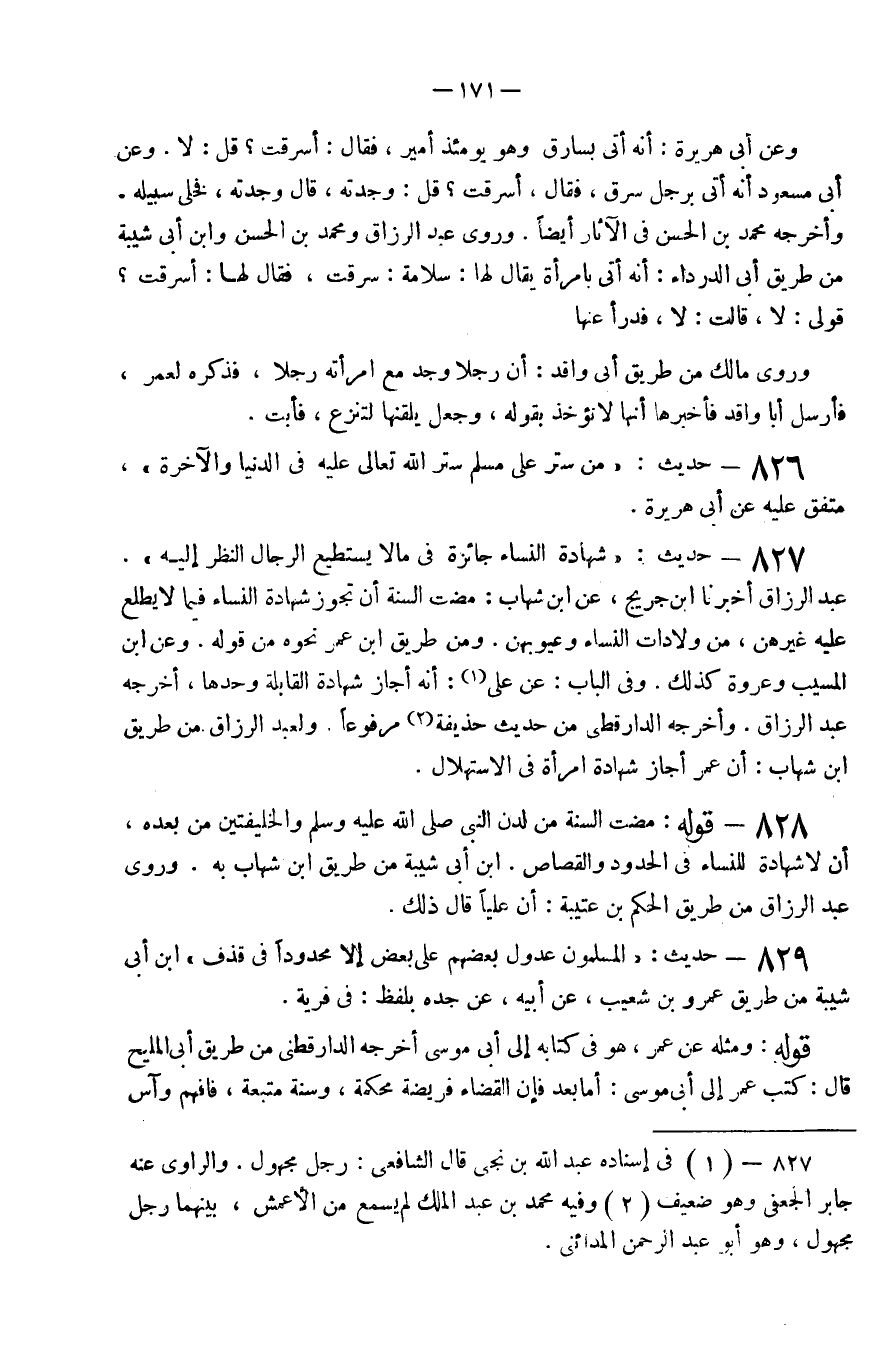827 - حَدِيث شَهَادَة النِّسَاء جَائِزَة فِي مَالا يَسْتَطِيع الرِّجَال النّظر إِلَيْهِ عبد الزاق أخبرنَا ابْن جريج عَن ابْن شهَاب مَضَت السّنة أَن تجوز شَهَادَة النِّسَاء فِيمَا لايطلع عَلَيْهِ غَيْرهنَّ من ولادات النِّسَاء وعيوبهن وَمن طَرِيق ابْن عمر نَحوه من قَوْله وَعَن ابْن الْمسيب وَعُرْوَة كَذَلِك وَفِي الْبَاب عَن عَلَى أَنه أجَاز شَهَادَة الْقَابِلَة وَحدهَا أخرجه عبد الرَّزَّاق وَأخرجه الدَّارَقُطْنِيّ من حَدِيث حُذَيْفَة مَرْفُوعا ولعَبْد الرَّزَّاق من طَرِيق ابْن شهَاب أَن عمر أجَاز شَهَادَة امْرَأَة فِي الاستهلال