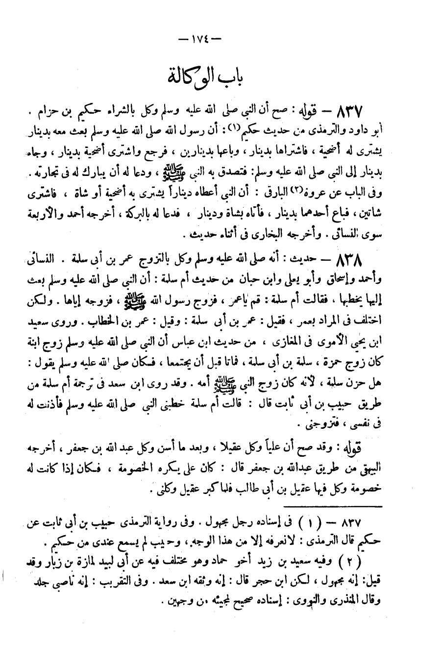 837 - قَوْله صَحَّ أَن النَّبِي صَلَّى اللَّهُ عَلَيْهِ وَسَلَّم َ وكل بِالشِّرَاءِ حَكِيم بن حزَام أَبُو دَاوُد وَالتِّرْمِذِيّ من حَدِيث حَكِيم أَن رَسُول الله صَلَّى اللَّهُ عَلَيْهِ وَسَلَّم َ بعث مَعَه بِدِينَار يَشْتَرِي لَهُ أضْحِية فاشتراها بِدِينَار وباعها بدينارين فَرجع وَاشْتَرَى أضْحِية بِدِينَار وَجَاء بِدِينَار إِلَى النَّبِي صَلَّى اللَّهُ عَلَيْهِ وَسَلَّم َ فَتصدق بِهِ النَّبِي صَلَّى اللَّهُ عَلَيْهِ وَسَلَّم َ ودعا لَهُ أَن يُبَارك لَهُ فِي تِجَارَته وَفِي الْبَاب عَن عُرْوَة الْبَارِقي أَن النَّبِي أعطَاهُ دِينَارا يَشْتَرِي بِهِ أضْحِية أَو شَاة فَاشْتَرَى شَاتين فَبَاعَ أَحدهمَا بِدِينَار فَأَتَاهُ بِشَاة ودينار فَدَعَا لَهُ بِالْبركَةِ أخرجه أَحْمد وَالْأَرْبَعَة سُوَى النَّسَائِيّ وَأخرجه البُخَارِيّ فِي أثْنَاء حَدِيث