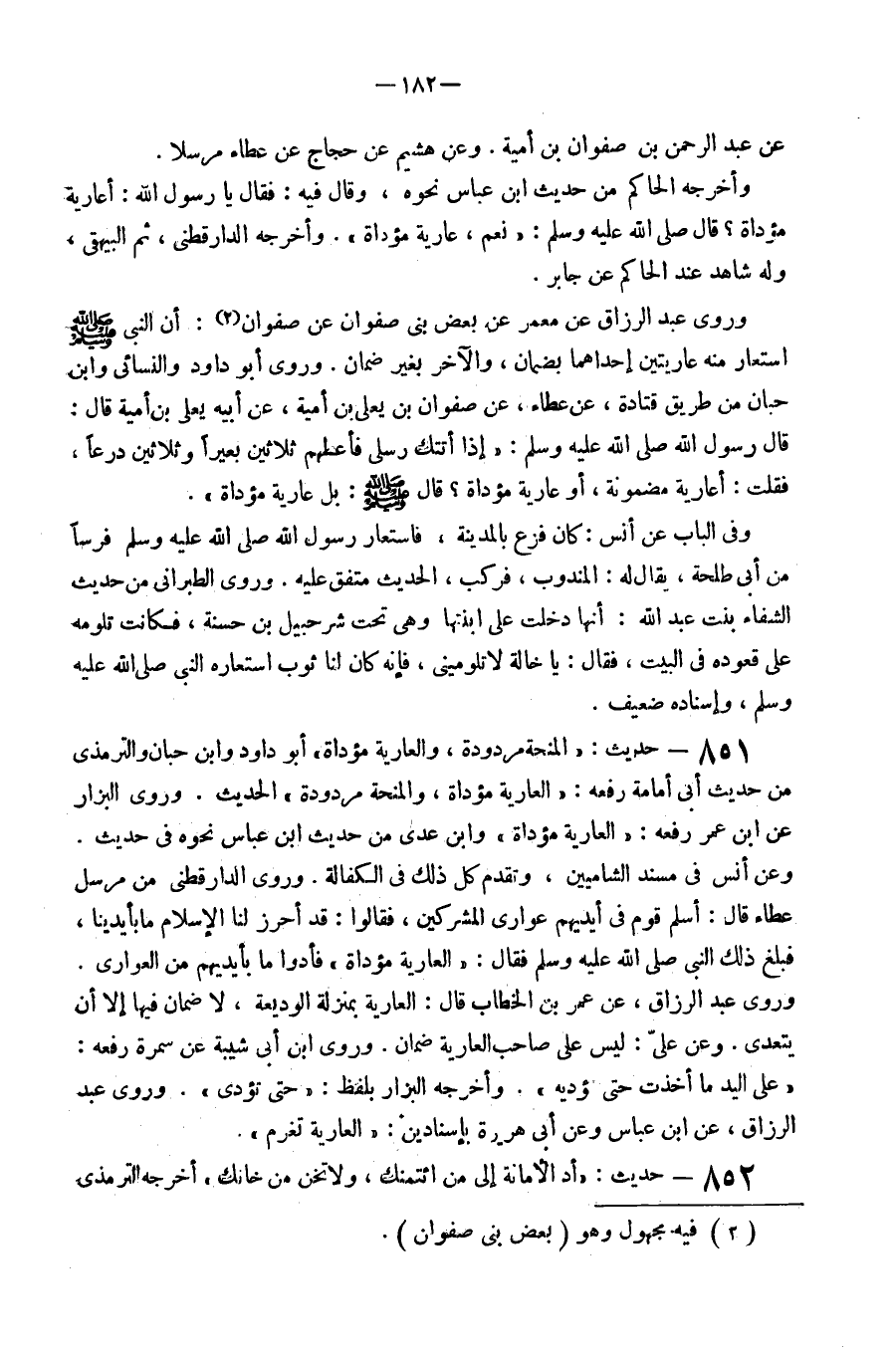 851 - حَدِيث المنحة مَرْدُودَة وَالْعَارِية مُؤَدَّاة أَبُو دَاوُد وَابْن حبَان وَالتِّرْمِذِيّ من حَدِيث أبي أُمَامَة رَفعه الْعَارِية مُؤَدَّاة والمنحة مَرْدُودَة الحَدِيث وَرَوَى الْبَزَّار عَن ابْن عمر رَفعه الْعَارِية مُؤَدَّاة وَابْن عدي من حَدِيث ابْن عَبَّاس نَحوه فِي حَدِيث وَعَن أنس فِي مُسْند الشاميين وَتقدم كل ذَلِك فِي الْكفَالَة وَرَوَى الدَّارَقُطْنِيّ من مُرْسل عَطاء قَالَ أسلم قوم فِي أَيْديهم عواري الْمُشْركين فَقَالُوا قد أحرز لنا الْإِسْلَام مَا بِأَيْدِينَا فَبلغ ذَلِك النَّبِي صَلَّى اللَّهُ عَلَيْهِ وَسَلَّم َ فَقَالَ الْعَارِية مُؤَدَّاة فأدوا مَا بِأَيْدِيهِم من العواري وَرَوَى عبد الرَّزَّاق عَن عمر بن الْخطاب قَالَ الْعَارِية بِمَنْزِلَة الْوَدِيعَة لَا ضَمَان فِيهَا إِلَّا أَن يتَعَدَّى وَعَن عَلّي لَيْسَ عَلَى صَاحب الْعَارِية ضَمَان وَرَوَى ابْن أبي شيبَة عَن سَمُرَة رَفعه عَلَى الْيَد مَا أخذت حَتَّى تُؤَدِّيه وَأخرجه الْبَزَّار بِلَفْظ حَتَّى تُؤدِّي وَرَوَى عبد الرَّزَّاق عَن ابْن عَبَّاس وَعَن أبي هُرَيْرَة بِإِسْنَادَيْنِ الْعَارِية تغرم