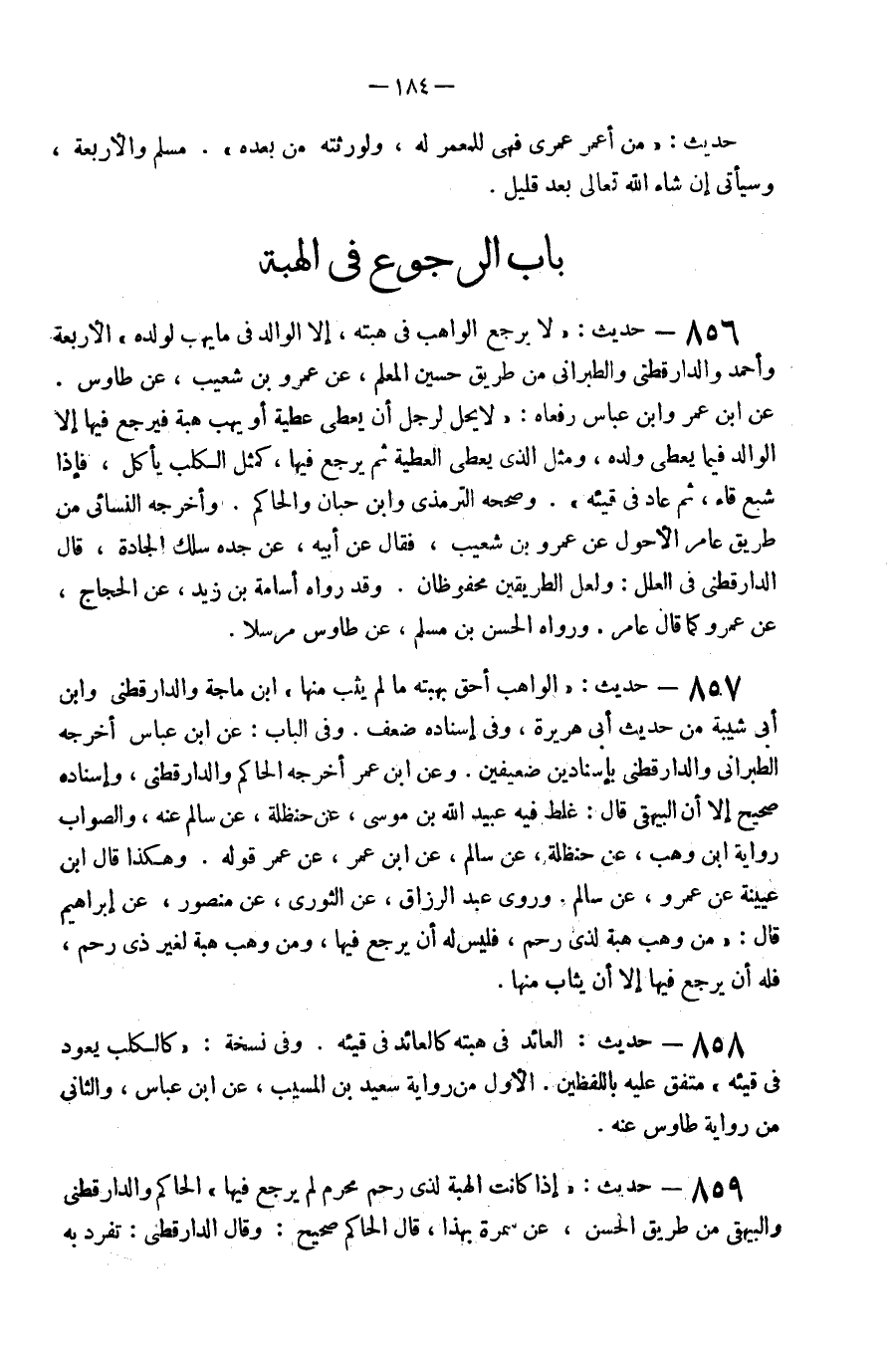 856 - حَدِيث لَا يرجع الْوَاهِب فِي هِبته إِلَّا الْوَالِد فِي مَا يهب لوَلَده الْأَرْبَعَة وَأحمد وَالدَّارَقُطْنِيّ وَالطَّبَرَانِيّ من طَرِيق حُسَيْن الْمعلم عَن عَمْرو بن شُعَيْب عَن طَاوس عَن ابْن عمر وَابْن عَبَّاس رَفَعَاهُ لَا يحل لرجل أَن يُعْطي عَطِيَّة أَو يهب هبة فَيرجع فِيهَا إِلَّا الْوَالِد فِيمَا يُعْطي وَلَده وَمثل الَّذِي يُعْطي الْعَطِيَّة ثمَّ يرجع فِيهَا كَمثل الْكَلْب يَأْكُل فَإِذا شبع قاء ثمَّ عَاد فِي قيئه وَصَححهُ التِّرْمِذِيّ وَابْن حبَان وَالْحَاكِم وَأخرجه النَّسَائِيّ من طَرِيق عَامر الْأَحول عَن عَمْرو بن شُعَيْب فَقَالَ عي أَبِيه عَن جده سلك الجادة قَالَ الدَّارَقُطْنِيّ فِي الْعِلَل وَلَعَلَّ الطَّرِيقَيْنِ محفوظان وَقد رَوَاهُ أُسَامَة بن زيد عَن الْحجَّاج عَن عَمْرو كَا قَالَ عَامر وَرَوَاهُ الْحسن بن مُسلم عَن طَاوس مُرْسلا