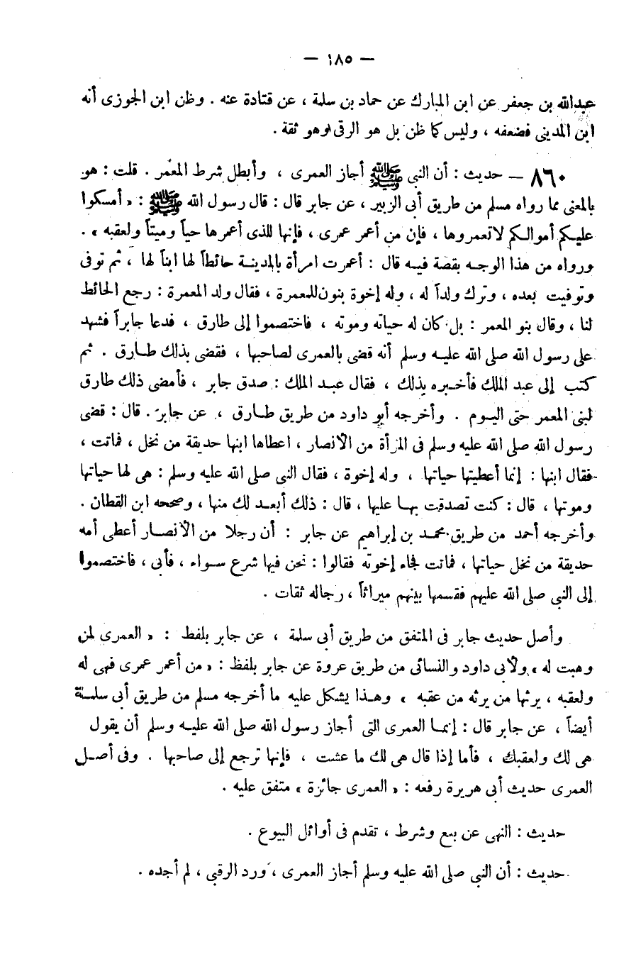 860 - حَدِيث أَن النَّبِي صَلَّى اللَّهُ عَلَيْهِ وَسَلَّم َ أجَاز الْعُمْرَى وأبطل شَرط المعمر قلت هُوَ بِالْمَعْنَى مِمَّا رَوَاهُ مُسلم من طَرِيق أبي الزبير عَن جَابر قَالَ قَالَ رَسُول الله صَلَّى اللَّهُ عَلَيْهِ وَسَلَّم َ أَمْسكُوا عَلَيْكُم أَمْوَالكُم لَا تعمروها فَإِن من أعمر عمرى فَإِنَّهَا للَّذي أعمرها حَيا وَمَيتًا ولعقبه وَرَوَاهُ من هَذَا الْوَجْه بِقصَّة فِيهِ قَالَ أعمرت امْرَأَة بِالْمَدِينَةِ حَائِطا لَهَا ابْنا لَهَا ثمَّ توفّي وَتوفيت بعده وَترك ولدا لَهُ وَله أخوة بنُون للمعمرة فَقَالَ ولد المعمرة رَجَعَ الْحَائِط لنا وَقَالَ بَنو المعمر بل كَانَ لَهُ حَيَاته وَمَوته فاختصموا إِلَى طَارق فَدَعَا جَابِرا فَشهد عَلَى رَسُول الله صَلَّى اللَّهُ عَلَيْهِ وَسَلَّم َ أَنه قَضَى بالعمرى لصَاحِبهَا فَقَضَى بذلك طَارق ثمَّ كتب إِلَى عبد الْملك فَأخْبرهُ بذلك فَقَالَ عبد الْملك صدق جَابر فَأَمْضَى ذَلِك طَارق لبني المعمر حَتَّى الْيَوْم وَأخرجه أَبُو دَاوُد من طَرِيق طَارق عَن جَابر قَالَ قَضَى رَسُول الله صَلَّى اللَّهُ عَلَيْهِ وَسَلَّم َ فِي الْمَرْأَة من الْأَنْصَار اعطاها ابْنهَا حديقة من نخل فَمَاتَتْ فَقَالَ ابْنهَا إِنَّمَا أعطيتهَا حَيَاتهَا وَله إخْوَة فَقَالَ النَّبِي صَلَّى اللَّهُ عَلَيْهِ وَسَلَّم َ هِيَ لَهَا حَيَاتهَا وموتها قَالَ كنت تَصَدَّقت بهَا عَلَيْهَا قَالَ ذَلِك أبعد لَك مِنْهَا وَصَححهُ ابْن الْقطَّان وَأخرجه أَحْمد من طَرِيق مُحَمَّد بن إِبْرَاهِيم عَن جَابر أَن رجلا من الْأَنْصَار أعْطى أمه حديقة من نخل حَيَاتهَا فَمَاتَتْ فجَاء إخْوَته فَقَالُوا نَحن فِيهَا شرع سَوَاء فَأَبَى فاختصموا إِلَى النَّبِي صَلَّى اللَّهُ عَلَيْهِ وَسَلَّم َ فَقَسمهَا بَينهم مِيرَاثا رِجَاله ثِقَات