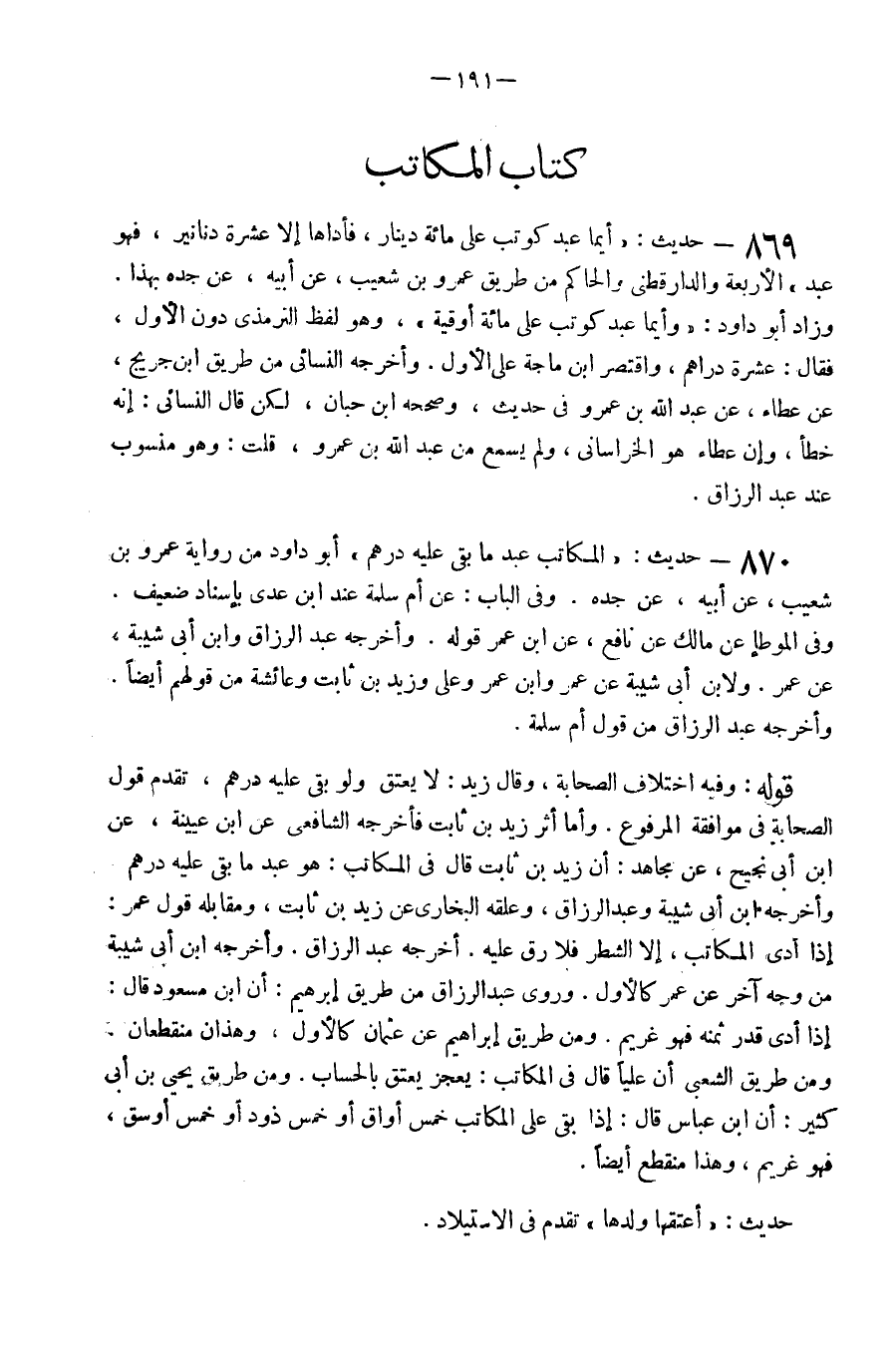 869 - حَدِيث إيما عبد كُوتِبَ عَلَى مائَة دِينَار فأداها إِلَّا عشرَة دَنَانِير فَهُوَ عبد الْأَرْبَعَة وَالدَّارَقُطْنِيّ وَالْحَاكِم من طَرِيق عَمْرو بن شُعَيْب عَن أَبِيه عَن جده بِهَذَا وَزَاد أَبُو دَاوُد وإيما عبد كُوتِبَ عَلَى مائَة أُوقِيَّة وَهُوَ لفظ التِّرْمِذِيّ دون الأول فَقَالَ عشرَة دَرَاهِم وَاقْتصر ابْن ماجة عَلَى الأول وَأخرجه النَّسَائِيّ من طَرِيق ابْن جريج عَن عَطاء عَن عبد الله بن عَمْرو فِي حَدِيث وَصَححهُ ابْن حبَان لَكِن قَالَ النَّسَائِيّ إِنَّه خطأ وَإِن عَطاء هُوَ الْخُرَاسَانِي وَلم يسمع من عبد الله بن عَمْرو قلت وَهُوَ مَنْسُوب عِنْد عبد الرَّزَّاق