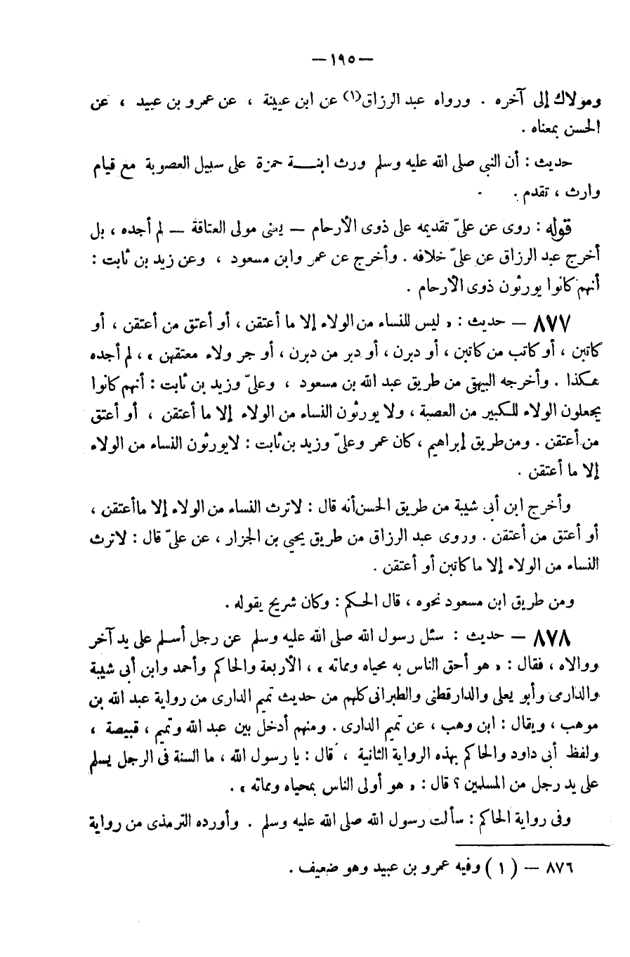قَوْله رَوَى عَن عَلّي تَقْدِيمه عَلَى ذَوي الْأَرْحَام يَعْنِي مولَى الْعتَاقَة لم أَجِدهُ بل أخرج عبد الرَّزَّاق عَن عَلّي خِلَافه وَأخرج عَن عمر وَابْن مَسْعُود وَعَن زيد بن ثَابت أَنهم كَانُوا يورثون ذَوي الْأَرْحَام