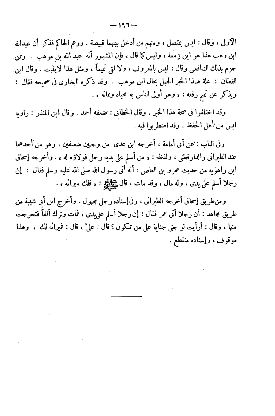 الأولَى وَقَالَ لَيْسَ بِمُتَّصِل وَمِنْهُم من أَدخل بَينهمَا قبيصَة وَوهم الْحَاكِم فَذكر أَن عبد الله ابْن وهب هَذَا هُوَ ابْن زَمعَة وَلَيْسَ كَمَا قَالَ فَإِن الْمَشْهُور أَنه عبد الله بن موهب وَمِمَّنْ جزم بذلك الشَّافِعِي وَقَالَ لَيْسَ بِالْمَعْرُوفِ وَلَا لقى تميما وَمثل هَذَا لايثبت وَقَالَ ابْن الْقطَّان عِلّة هَذَا الْخَبَر الْجَهْل بِحَال ابْن موهب وَقد ذكره البُخَارِيّ فِي صَحِيحه فَقَالَ وَيذكر عَن تَمِيم رَفعه وَهُوَ أولَى النَّاس بِهِ محياه ومماته