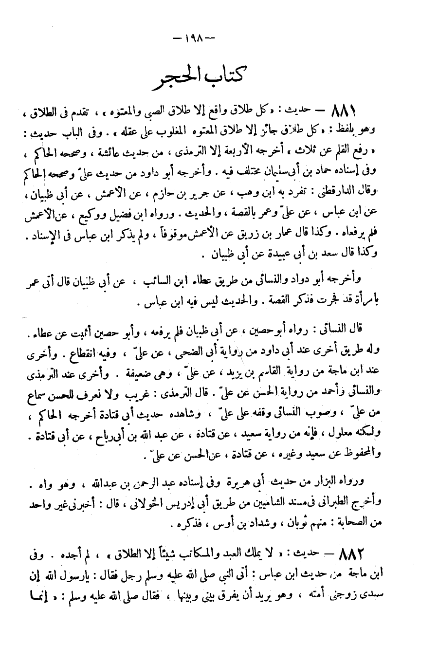 881 - حَدِيث كل طَلَاق وَاقع إِلَّا طَلَاق الصَّبِي وَالْمَعْتُوه تقدم فِي الطَّلَاق وَهُوَ بِلَفْظ كل طَلَاق جَائِز إِلَّا طَلَاق الْمَعْتُوه المغلوب عَلَى عقله وَفِي الْبَاب حَدِيث رفع الْقَلَم عَن ثَلَاث أخرجه الْأَرْبَعَة إِلَّا التِّرْمِذِيّ من حَدِيث عَائِشَة وَصَححهُ الْحَاكِم وَفِي إِسْنَاده حَمَّاد بن أبي سُلَيْمَان مُخْتَلف فِيهِ وَأخرجه أَبُو دَاوُد من حَدِيث عَلَى وَصَححهُ الْحَاكِم وَقَالَ الدَّارَقُطْنِيّ تفرد بِهِ ابْن وهب عَن جرير بن حَازِم عَن الْأَعْمَش عَن أبي ظبْيَان عَن ابْن عَبَّاس عَن عَلَى وَعمر بالقصة والْحَدِيث وَرَوَاهُ ابْن فُضَيْل ووكيع عَن الْأَعْمَش فَلم يَرْفَعَاهُ وَكَذَا قَالَ عمار بن زُرَيْق عَن الْأَعْمَش مَوْقُوفا وَلم يذكر ابْن عَبَّاس فِي الْإِسْنَاد وَكَذَا قَالَ سعد بن أبي عُبَيْدَة عَن أبي ظبْيَان