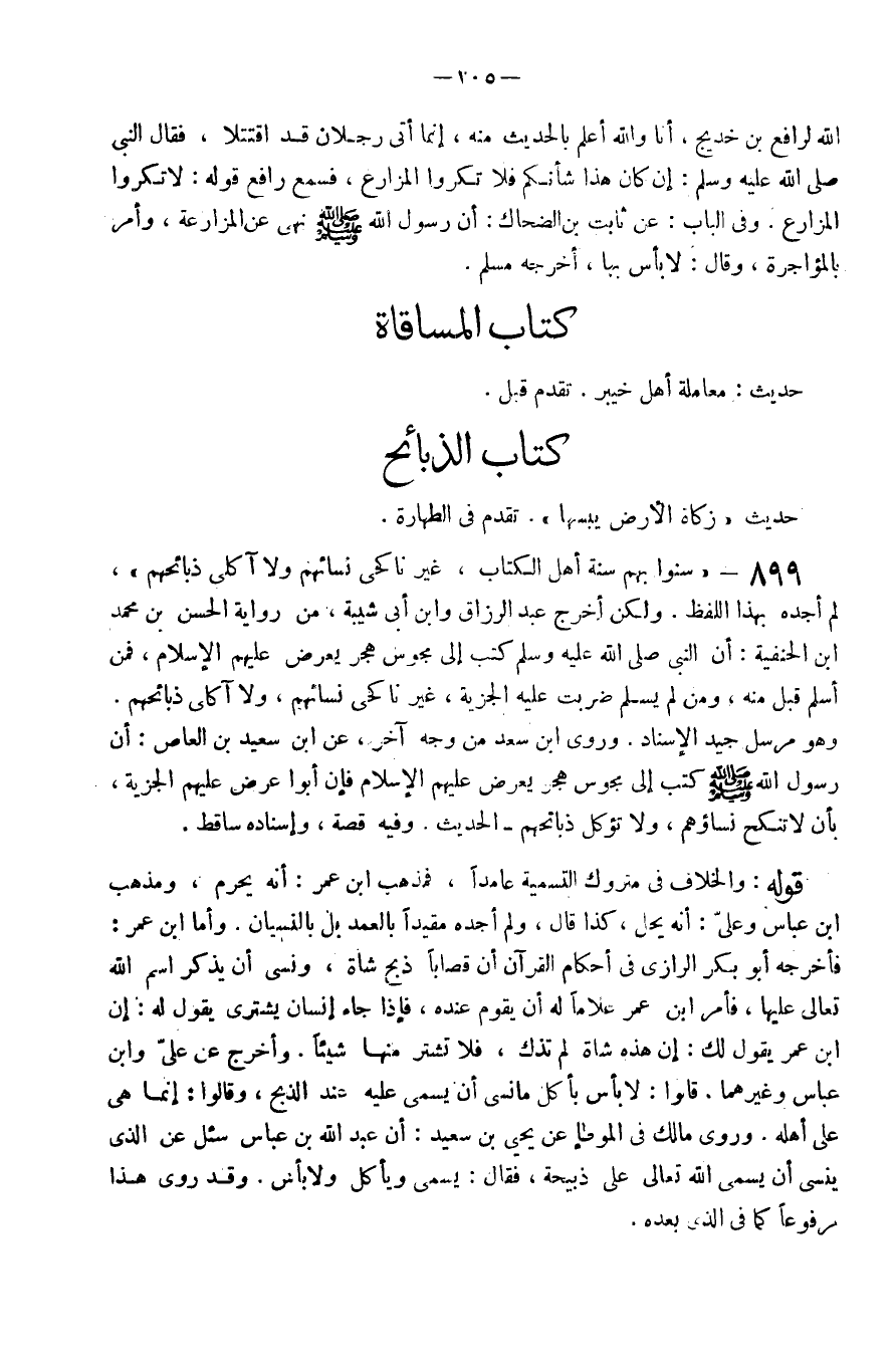 899 - سنوا بهم سنة اهل الْكتاب غير ناكحي نِسَائِهِم وَلَا آكِلِي ذَبَائِحهم لم أَجِدهُ بِهَذَا اللَّفْظ وَلَكِن أخرج عبد الرَّزَّاق وَابْن ابي شيبَة من رِوَايَة الْحسن بن مُحَمَّد ابْن الحنيفة أَن النَّبِي صَلَّى اللَّهُ عَلَيْهِ وَسَلَّم َ كتب إِلَى مجوس هجر يعرض عَلَيْهِم الْإِسْلَام فَمن اسْلَمْ قبل مِنْهُ وَمن لم يسلم ضربت عَلَيْهِ الْجِزْيَة غير ناكحي نِسَائِهِم ولاآكلي ذَبَائِحهم وَهُوَ مُرْسل جيد الْإِسْنَاد وَرَوَى ابْن سعد من وَجه آخر عَن ابْن سعيد بن الْعَاصِ أَن رَسُول الله صَلَّى اللَّهُ عَلَيْهِ وَسَلَّم َ كتب إِلَى مجوس هجر يعرض عَلَيْهِم الْإِسْلَام فَإِن أَبَوا عرض عَلَيْهِم الْجِزْيَة بِأَن لاتنكح نِسَاؤُهُم وَلَا تُؤْكَل ذَبَائِحهم الحَدِيث وَفِيه قصَّة وَإِسْنَاده سَاقِط