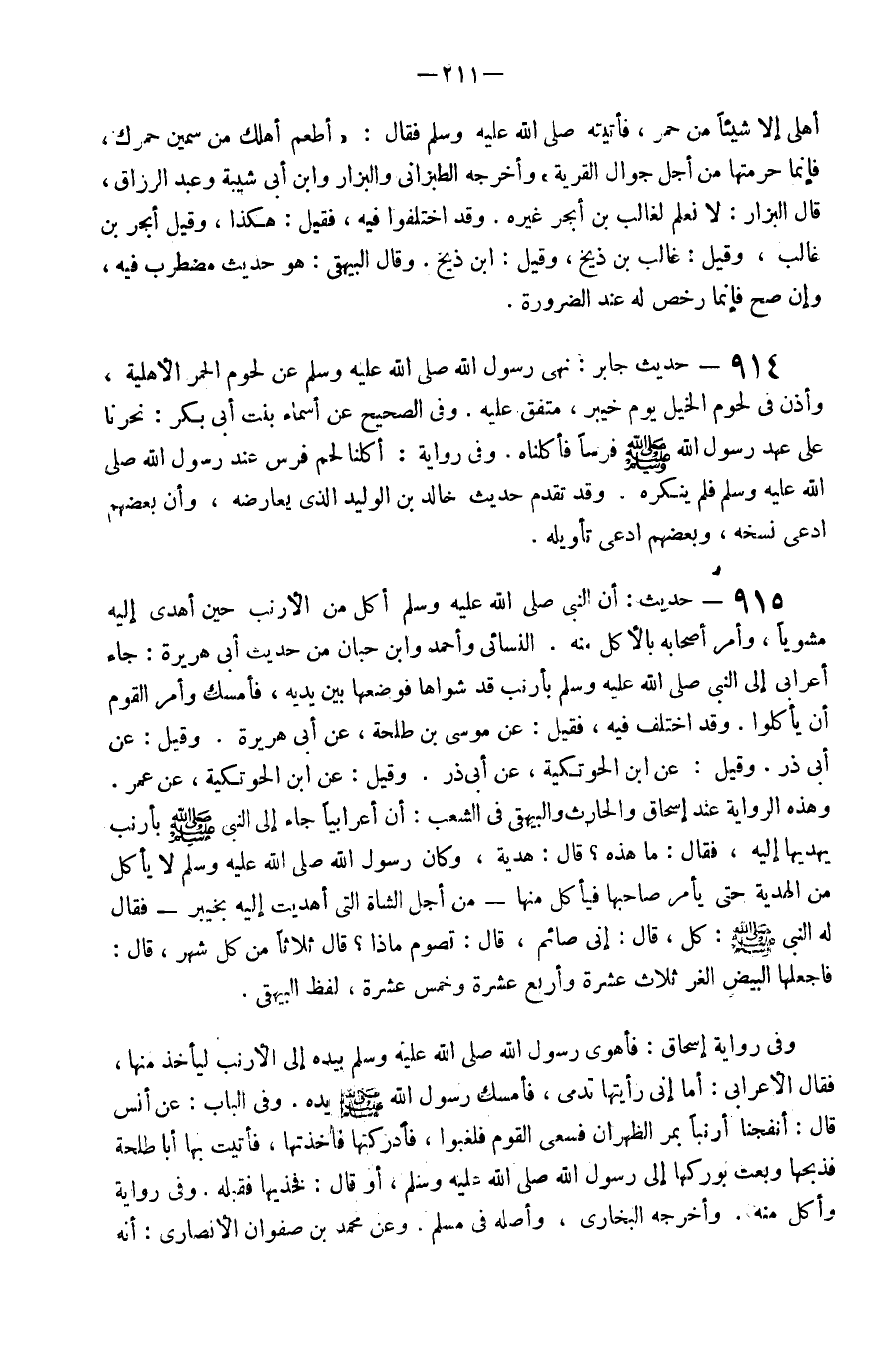 915 - حَدِيث أَن النَّبِي صَلَّى اللَّهُ عَلَيْهِ وَسَلَّم َ أكل من الأرنب حِين أهْدَى إِلَيْهِ مشويا وَأمر أَصْحَابه بِالْأَكْلِ مِنْهُ النَّسَائِيّ وَأحمد وَابْن حبَان من حَدِيث أبي هُرَيْرَة جَاءَ أَعْرَابِي إِلَى النَّبِي صَلَّى اللَّهُ عَلَيْهِ وَسَلَّم َ بأرنب قد شواها فوضعها بَين يَدَيْهِ فَأمْسك وَأمر الْقَوْم أَن يَأْكُلُوا وَقد اخْتلف فِيهِ فَقيل عَن مُوسَى بن طَلْحَة عَن أبي هُرَيْرَة وَقيل عَن أبي ذَر وَقيل عَن ابْن الحوتكية عَن أبي ذَر وَقيل عَن ابْن الحوتكية عَن عمر وَهَذِه الرِّوَايَة عِنْد إِسْحَاق والْحَارث وَالْبَيْهَقِيّ فِي الشّعب أَن أَعْرَابِيًا جَاءَ إِلَى النَّبِي صَلَّى اللَّهُ عَلَيْهِ وَسَلَّم َ بأرنب يهديها إِلَيْهِ فَقَالَ مَا هَذِه قَالَ هَدِيَّة وَكَانَ رَسُول الله صَلَّى اللَّهُ عَلَيْهِ وَسَلَّم َ لَا يَأْكُل من الْهَدِيَّة حَتَّى يَأْمر صَاحبهَا فيأكل مِنْهَا من أجل الشَّاة الَّتِي أهديت إِلَيْهِ بِخَيْبَر فَقَالَ لَهُ النَّبِي صَلَّى اللَّهُ عَلَيْهِ وَسَلَّم َ كل قَالَ إِنِّي صَائِم قَالَ تَصُوم مَاذَا قَالَ ثَلَاثًا من كل شهر قَالَ فاجعلها الْبيض الغر ثَلَاث عشرَة وَأَرْبع عشرَة وَخمْس عشرَة لفظ الْبَيْهَقِيّ