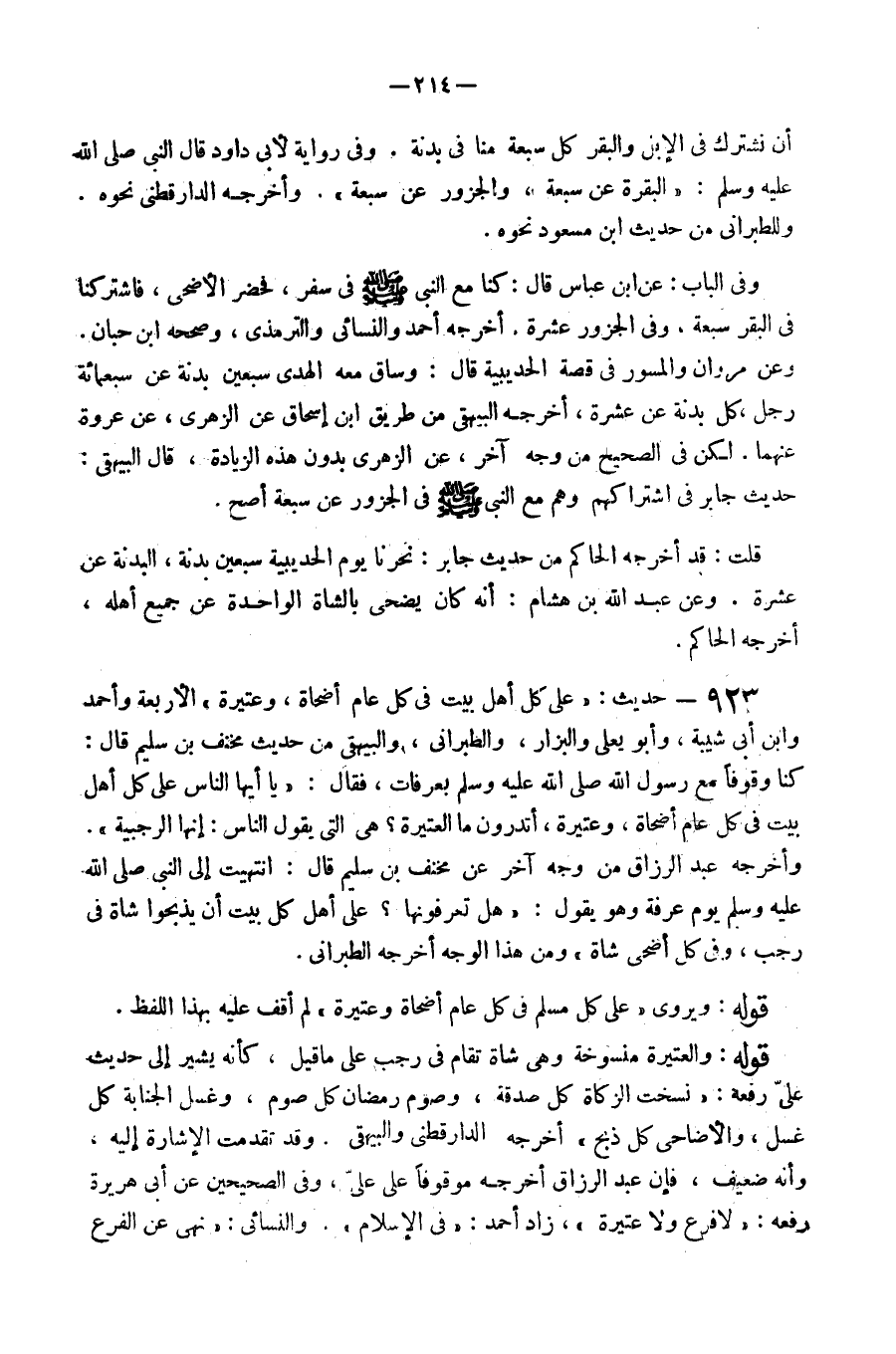 923 - حَدِيث عَلَى كل أهل بَيت فِي كل عَام أضحاة وعتيرة الْأَرْبَعَة وَأحمد وَابْن أبي شيبَة وَأَبُو يعْلى وَالْبَزَّار وَالطَّبَرَانِيّ وَالْبَيْهَقِيّ من حَدِيث مخنف بن سليم قَالَ كُنَّا وقوفا مَعَ رَسُول الله صَلَّى اللَّهُ عَلَيْهِ وَسَلَّم َ بِعَرَفَات فَقَالَ يَا أَيهَا النَّاس عَلَى كل أهل بَيت فِي كل عَام أضحاة وعتيرة أَتَدْرُونَ ماالعتيرة هِيَ الَّتِي يَقُول النَّاس إِنَّهَا الرجبية وَأخرجه عبد الرَّزَّاق من وَجه آخر عَن مخنف بن سليم قَالَ انْتَهَيْت إِلَى النَّبِي صَلَّى اللَّهُ عَلَيْهِ وَسَلَّم َ يَوْم عَرَفَة وَهُوَ يَقُول هَل تعرفونها عَلَى أهل كل بَيت أَن يذبحوا شَاة فِي رَجَب وَفِي كل أَضْحَى شَاة وَمن هَذَا الْوَجْه أخرجه الطَّبَرَانِيّ