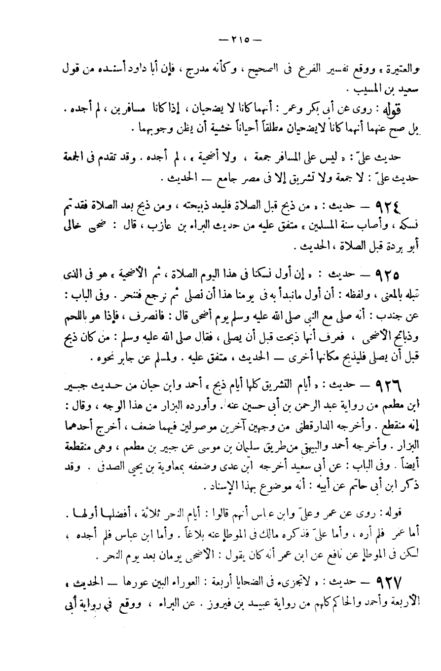 925 - حَدِيث إِن أول نسكنا فِي هَذَا الْيَوْم الصَّلَاة ثمَّ الْأُضْحِية هُوَ فِي الَّذِي قبله بِالْمَعْنَى وَلَفظه أَن أول مَا نبدأ بِهِ فِي يَوْمنَا أَن نصلي ثمَّ نرْجِع فننحر وَفِي الْبَاب عَن جُنْدُب أَنه صَلَّى مَعَ النَّبِي صَلَّى اللَّهُ عَلَيْهِ وَسَلَّم َ يَوْم أَضْحَى قَالَ فَانْصَرف فَإِذا هُوَ بِاللَّحْمِ وذبائح الْأَضْحَى فَعرف أَنَّهَا ذبحت قبل أَن يُصَلِّي فَقَالَ صَلَّى اللَّهُ عَلَيْهِ وَسَلَّم َ من كَانَ ذبح قبل أَن يُصَلِّي فليذبح مَكَانهَا أُخْرَى الحَدِيث مُتَّفق عَلَيْهِ وَلمُسلم عَن جَابر نَحوه