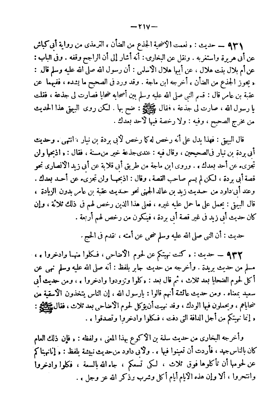 932 - حَدِيث كنت نَهَيْتُكُمْ عَن لُحُوم الْأَضَاحِي فَكُلُوا مِنْهَا وَادخرُوا مُسلم من حَدِيث بُرَيْدَة وَأخرجه من حَدِيث جَابر بِلَفْظ أَنه صَلَّى اللَّهُ عَلَيْهِ وَسَلَّم َ نهَى عَن أكل لُحُوم الضَّحَايَا بعد ثَلَاث ثمَّ قَالَ بعد كلوا وتزودوا وَادخرُوا وَمن حَدِيث أبي سعيد بِمَعْنَاهُ وَمن حَدِيث عَائِشَة أَنهم قَالُوا يَا رَسُول الله إِن النَّاس يتخذون الأسقية من ضحاياهم ويحملون فِيهَا الودك وَقد نهيت أَن يُؤْكَل لُحُوم الْأَضَاحِي بعد ثَلَاث فَقَالَ صَلَّى اللَّهُ عَلَيْهِ وَسَلَّم َ إِنَّمَا نَهَيْتُكُمْ من أجل الدافة الَّتِي دفت فَكُلُوا وَادخرُوا وتصدقوا