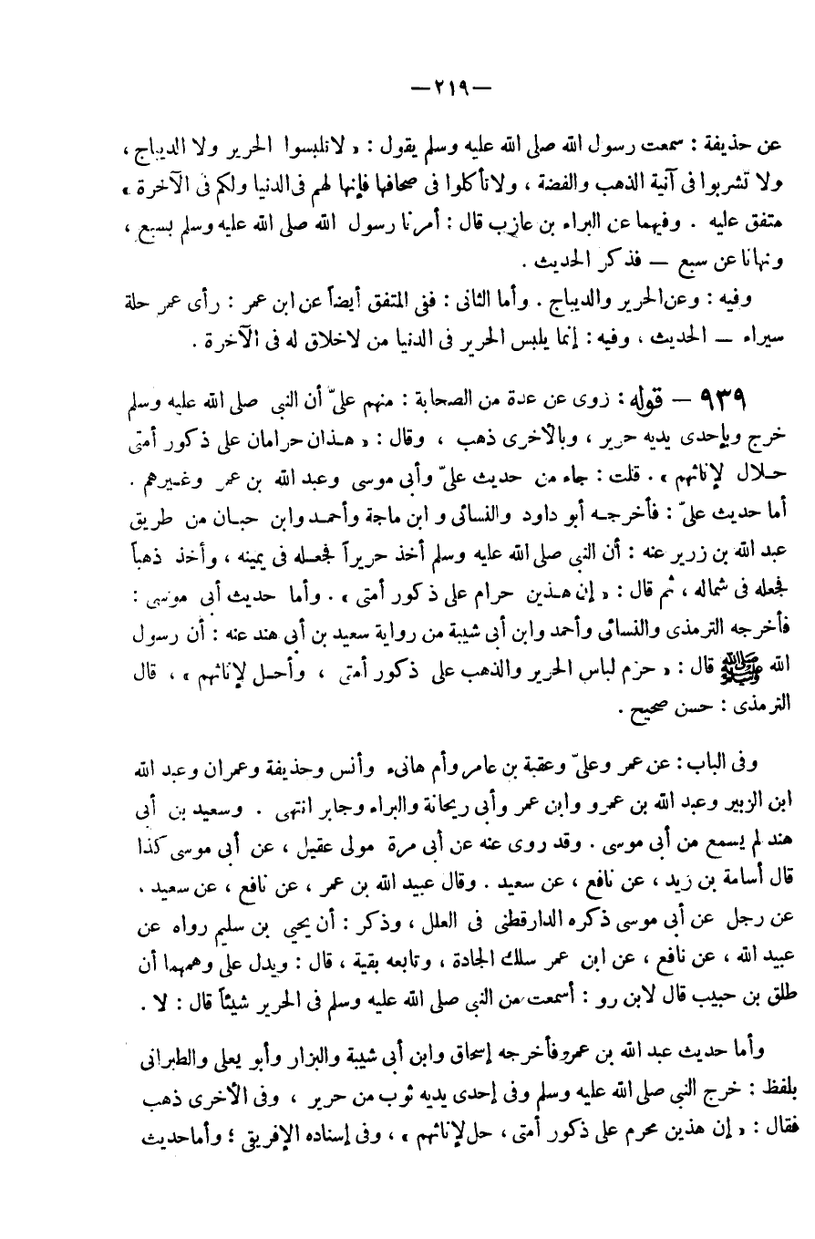 939 - قَوْله رَوَى عَن عدَّة من الصَّحَابَة مِنْهُم عَلّي أَن النَّبِي صَلَّى اللَّهُ عَلَيْهِ وَسَلَّم َ خرج وبإحدى يَدَيْهِ حَرِير وبالأخرى ذهب وَقَالَ هَذَانِ حرامان عَلَى ذُكُور أمتِي حَلَال لإناثهم قلت جَاءَ من حَدِيث عَلّي وَأبي مُوسَى وَعبد الله بن عمر وَغَيرهم أما حَدِيث عَلّي فَأخْرجهُ أَبُو دَاوُد وَالنَّسَائِيّ وَابْن ماجة وَأحمد وَابْن حبَان من طَرِيق عبد الله بن زرير عَنهُ أَن النَّبِي صَلَّى اللَّهُ عَلَيْهِ وَسَلَّم َ أَخذ حَرِيرًا فَجعله فِي يَمِينه وَأخذ ذَهَبا فَجعله فِي شِمَاله ثمَّ قَالَ إِن هذَيْن حرَام عَلَى ذُكُور أمتِي وَأما حَدِيث أبي مُوسَى فَأخْرجهُ التِّرْمِذِيّ وَالنَّسَائِيّ وَأحمد وَابْن أبي شيبَة من رِوَايَة سعيد بن أبي هِنْد عَنهُ أَن رَسُول الله صَلَّى اللَّهُ عَلَيْهِ وَسَلَّم َ قَالَ حرم لِبَاس الْحَرِير وَالذَّهَب عَلَى ذُكُور أمتِي وَأحل لإناثهم قَالَ التِّرْمِذِيّ حسن صَحِيح