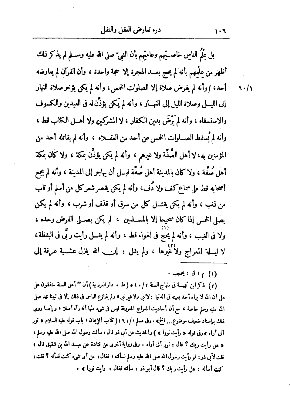 بل علم الناس خاصتهم وعامتهم بأن النبي صلي الله عليه وسلم لم يذكر ذلك أظهر من علمهم بأنه لم يحج بعد الهجرة إلا حجة واحدة، وأن القرآن لم يعارضه أحد، وأنه لم يفرض صلاة إلا الصلوات الخمس، وأنه لم يكن يؤخر صلاة النهار إلي الليل وصلاة الليل إلي النهار، وأنه لم يكن يؤذن له في العيدين والكسوف والاستسقاء، وأنه لم يرض بدين الكفار، لا المشركين ولا أهل الكتاب قط، وأنه لم يسقط الصلوات الخمس عن أحد من العقلاء، وأنه لم يقاتله أحد من المؤمنين به، لا أهل الصفة ولا غيرهم، وأنه لم يكن يؤذن بمكة، ولا كان بمكة أهل صفة، ولا كان بالمدينة أهل صفة قبل أن يهاجر إلي المدينة، وأنه لم يجمع أصحابه قط علي سماع كف ولا دف، وأنه لم يكن يقصر شعر كل من أسلم أو تاب من ذنب، وأنه لم يكن يقتل كل من سرق أو قذف أو شرب، وأنه لم يكن يصلي الخمس إذا كان صحيحاً إلا بالمسلمين، لم يكن يصلي الفرض وحده، ولا في الغيب، وأنه لم يحج في الهواء قط، وأنه لم يقل رأيت ربي في اليقظة، لا ليلة المعراج ولا غيرها، ولم يقل: إن الله ينزل عشية عرفة إلي