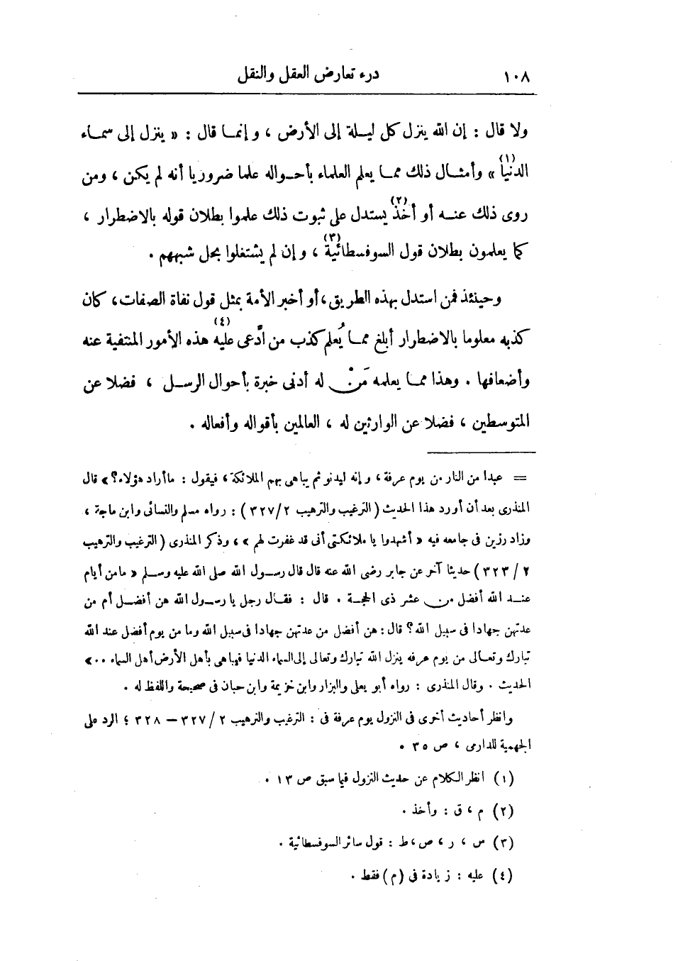 ولا قال: إن الله ينزل كل ليلة إلي الأرض، وإنما قال: ينزل إلي سماء الدنيا وأمثال ذلك مما يعلم العلماء بأحواله علماً ضرورياً أنه لم يكن، ومن روي ذلك عنه أو أخذ يستدل علي ثبوت ذلك علموا بطلان قوله بالاضطرار، كما يعلمون بطلان قول السوفسطائية، وإن لم يشتغلوا بحل شبههم.