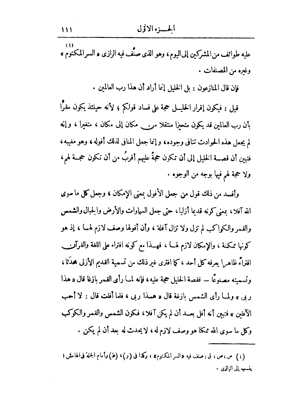 فلما أفلت قال: لا أحب الآفلين فتبين أنه أفل بعد أن لم يكن آفلاً، فكون الشمس والقمر والكواكب وكل ما سوي الله ممكنا هو وصف لازم له، لا يحدث له بعد أن لم يكن.
