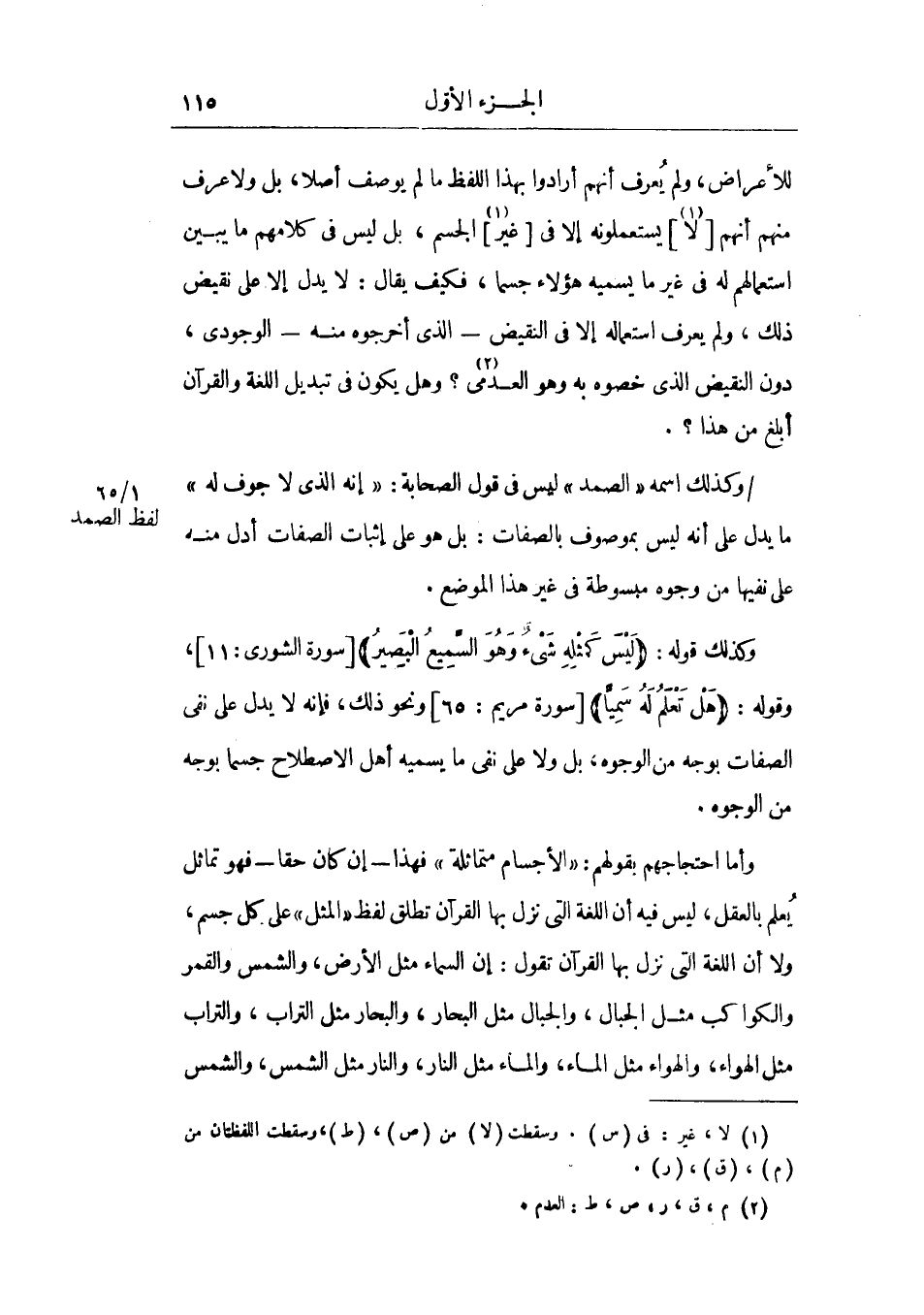 وأما احتجاجهم بقولهم: الأجسام متماثلة فهذا ـ إن كان حقاً ـ فهو تماثل يعلم بالعقل، ليس فيه أن اللغة التي نزل بها القرآن تطلق لفظ المثل علي كل جسم، ولا أن اللغة التي نزل بها القرآن تقول: إن السماء مثل الأرض، والشمس والقمر والكواكب مثل الجبال، والجبال مثل البحار، والبحار مثل التراب، والتراب مثل الهواء، والهواء مثل الماء، والماء مثل النار، والنار مثل الشمس، والشمس