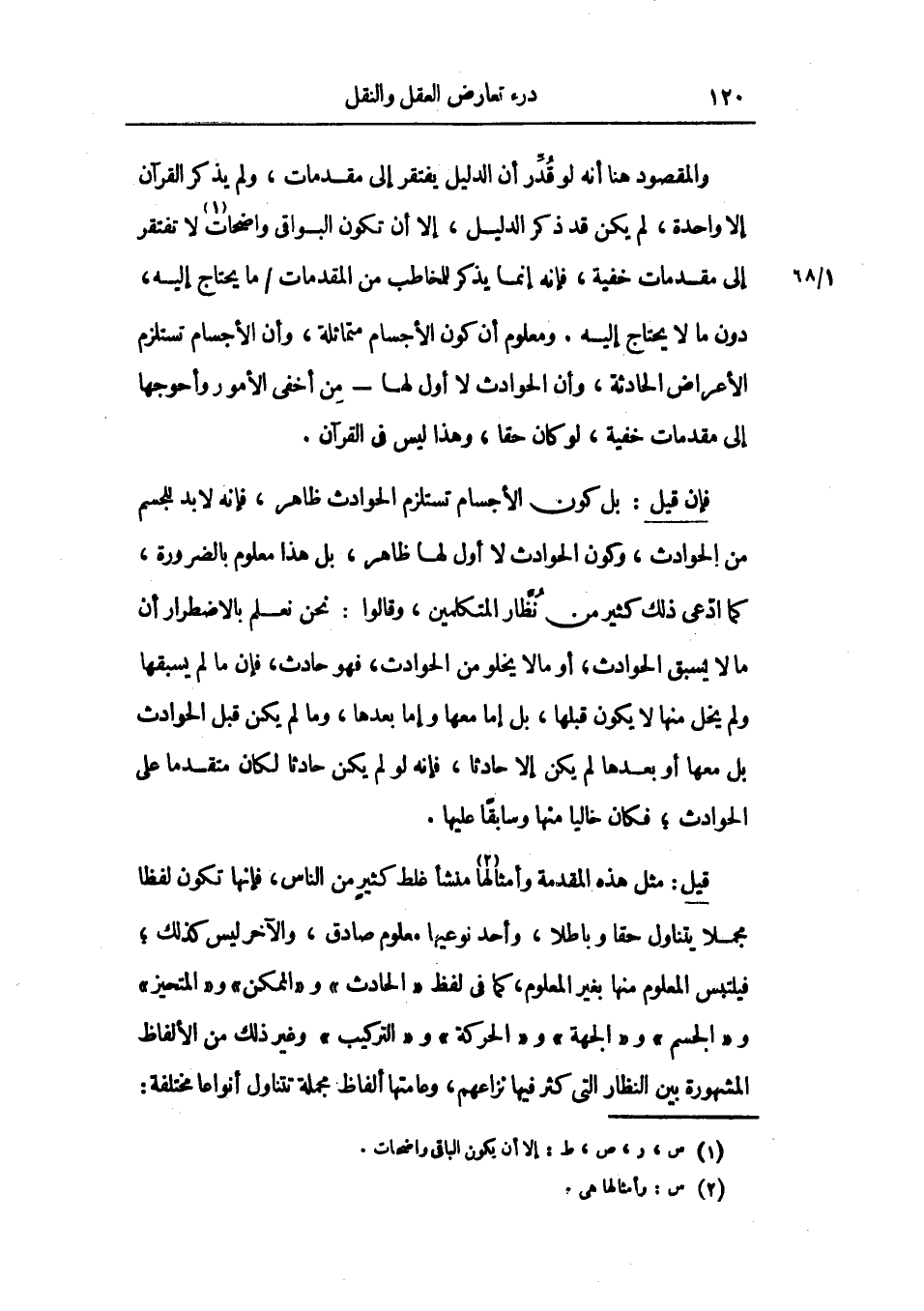 قيل: مثل هذه المقدمة وأمثالها منشأ غلط كثير من الناس، فإنها تكون لفظاً مجملاً يتناول حقاً وباطلاً، وأحد نوعيها معلوم صادق، والآخر ليس كذلك، فيلتبس المعلوم منها بغير المعلوم، كما في لفظ الحادث والممكن والمتحيز والجسم والجهة والحركة والتركيب وغير ذلك من الألفاظ المشهورة بين النظار التي كثر فيها نزاعهم، وعامتها ألفاظ مجملة تتناول أنواعاً مختلفة: