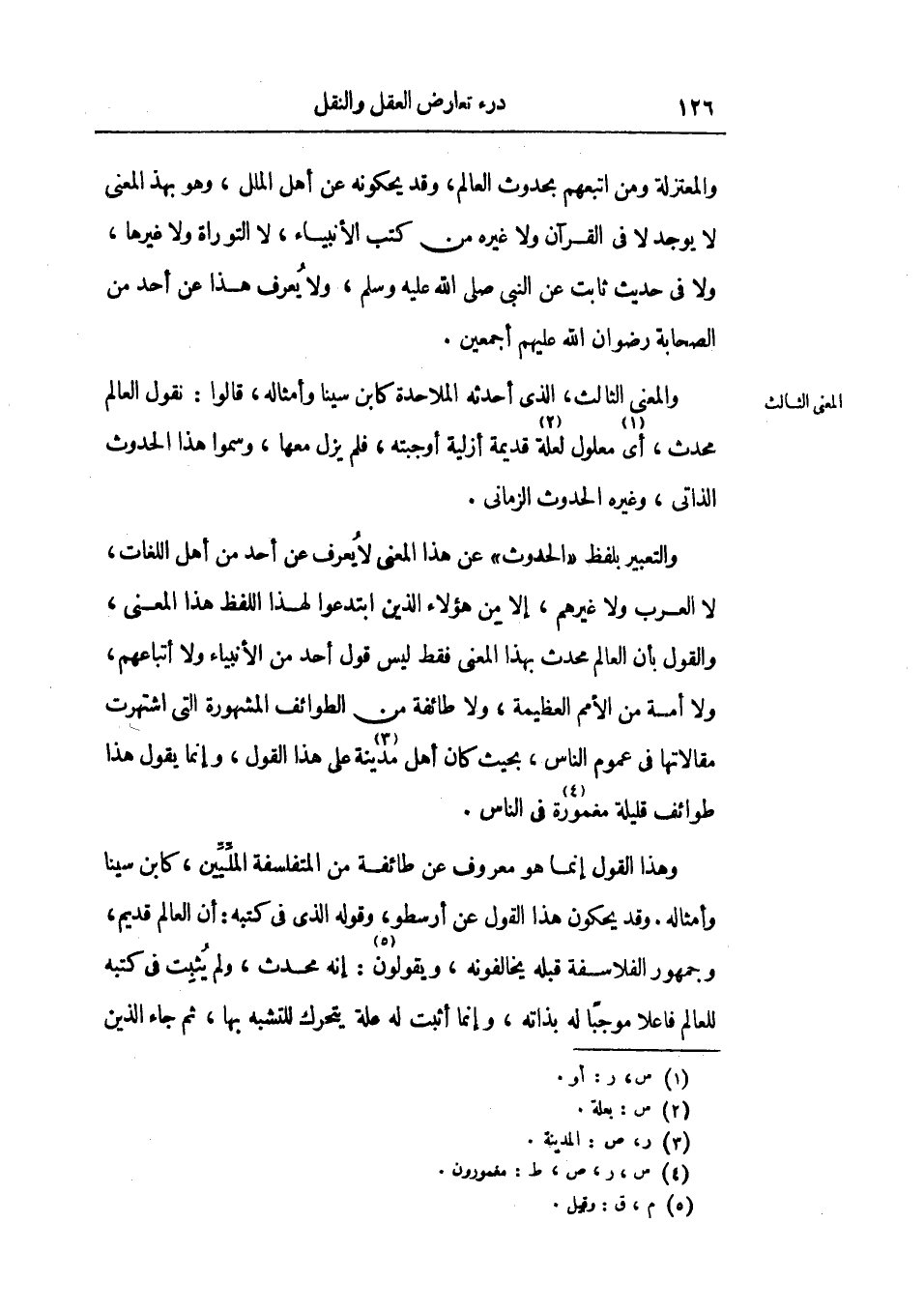 والتعبير بلفظ الحدوث عن هذا المعني لا يعرف عن أحد من أهل اللغات، لا العرب ولا غيرهم، إلا من هؤلاء الذين ابتدعوا لهذا اللفظ هذا المعني، والقول بأن العالم محدث بهذا المعني فقط ليس قول أحد من الأنبياء ولا أتباعهم، ولا أمة من الأمم العظيمة ولا طائفة من الطوائف المشهورة التي اشتهرت مقالاتها في عموم الناس، بحيث كان أهل مدينة علي هذا القول، إنما يقول هذا طوائف قليلة مغمورة في الناس.