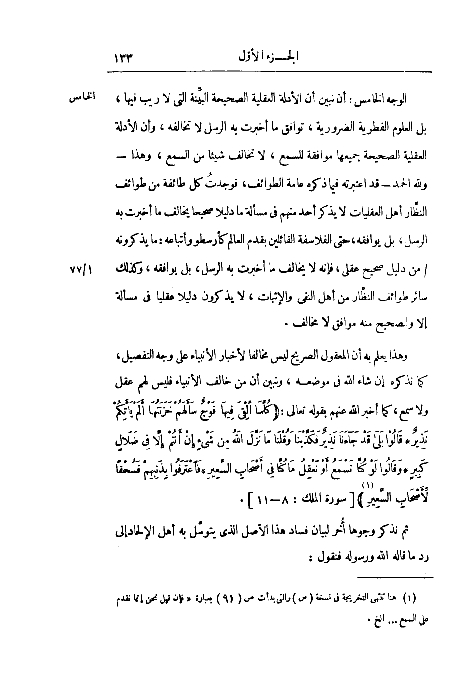الوجه الخامس: أن نبين أن الأدلة العقلية الصحيحة البينة التي لا ريب فيها، بل العلوم الفطرية الضرورية، توافق ما أخبرت به الرسل لا تخالفه، وأن الأدلة العقلية الصحيحة جميعها موافقة للسمع، لا تخالف شيئاً من السمع، وهذا ـ ولله الحمد ـ قد اعتبرته فيما ذكره عامة الطوائف، فوجدت كل طائفة من طوائف النظار أهل العقليات لا يذكر أحد منهم في مسألة ما دليلاً صحيحاً يخالف ما أخبرت به الرسل، بل يوافقه، حتى الفلاسفة القائلين بقدم العالم كأرسطو وأتباعه: ما يذكرونه من دليل صحيح عقلي، فإنه لا يخالف ما أخبرت به الرسل، بل يوافقه، وكذلك سائر طوائف النظار من أهل النفي والإثبات، لا يذكرن دليلاً عقلياً في مسألة إلا والصحيح منه موافق لا مخالف.