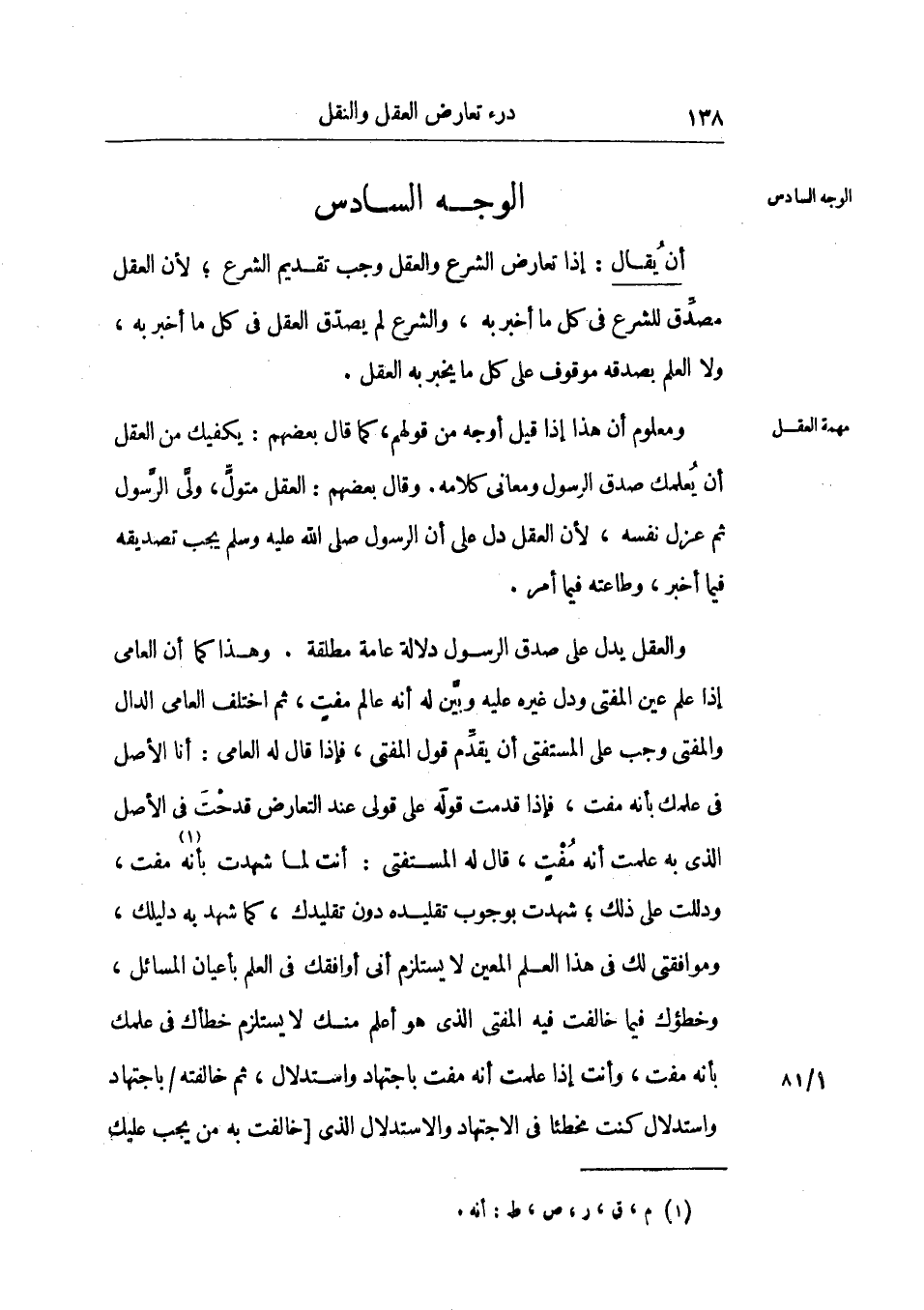 أن يقال: إذا تعارض الشرع والعقل وجب تقديم الشرع، لأن العقل مصدق للشرع في كل ما أخبر به، والشرع لم يصدق العقل في كل ما أخبر به، ولا العلم بصدقه موقوف علي كل ما يخبر به العقل.