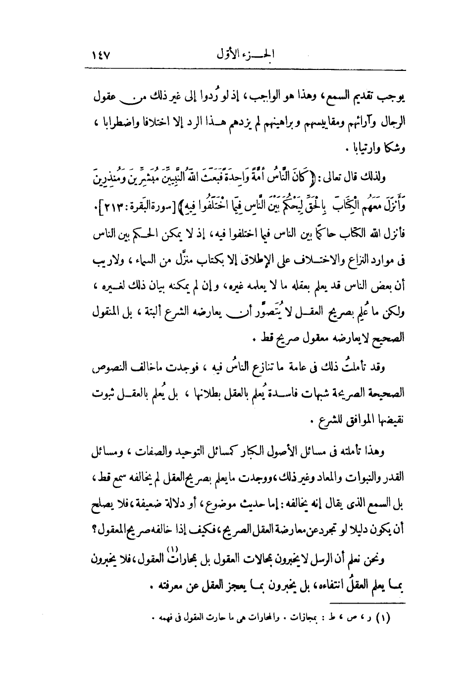 فأنزل الله الكتاب حاكماً بين الناس فيما اختلفوا فيه، إذ لا يمكن الحكم بين الناس في موارد النزاع والاختلاف علي الإطلاق إلا بكتاب منزل من السماء، ولا ريب أن بعض الناس قد يعلم بعقله ما لا يعلمه غيره، وإن لم يمكنه بيان ذلك لغيره، ولكن ما علم بصريح العقل لا يتصور أن يعارضه الشرع البتة، بل المنقول الصحيح لا يعارضه معقول صريح قط.