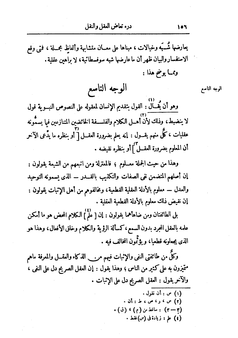 وهو أن يقال: القول بتقديم الإنسان لمعقوله علي النصوص النبوية قول لا ينضبط، وذلك لأن أهل الكلام والفلسفة الخائضين المتنازعين فيما يسمونه عقليات، كل منهم يقول: إنه يعلم بضرورة العقل أو بنظره ما يدعي الآخر أن المعلوم بضروة العقل أو بنظره نقيضه.