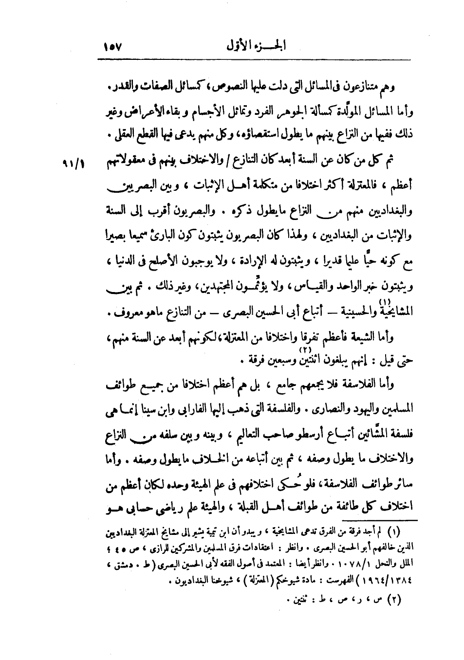 ثم كل من كان عن السنة أبعد كان التنازع والاختلاف بينهم في معقولاتهم أعظم، فالمعتزلة أكثر اختلافاً من متكلمة أهل الإثبات، وبين البصريين والبغداديين منهم من النزاع ما يطول ذكره، والبصريون أقرب إلي السنة والإثبات من البغداديين، ولهذا كان البصريون يثبتون كون الباريء سميعاً بصيراً مع كونه حياً عليماً قديراً، ويثبتون له الإرادة، ولا يوجبون الأصلح في الدنيا، ويثبتون خبر الواحد والقياس، ولا يؤثمون المجتهدين، وغير ذلك.