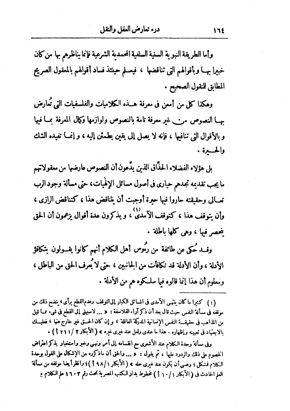 بل هؤلاء الفضلاء الحذاق الذي يدعون أن النصوص عارضها من معقولاتهم ما يجب تقديمه تجدهم حيارى في أصول مسائل الإلهيات، حتى مسألة وجود الرب تعالي وحقيقته حاروا فيها حيرة أوجبت أن يتناقض هذا، كتناقض الرازي، وأن يتوقف هذا، كتوقف الآمدي، ويذكرون عدة أقوال يزعمون أن الحق ينحصر فيها، وهي كلها باطلة.