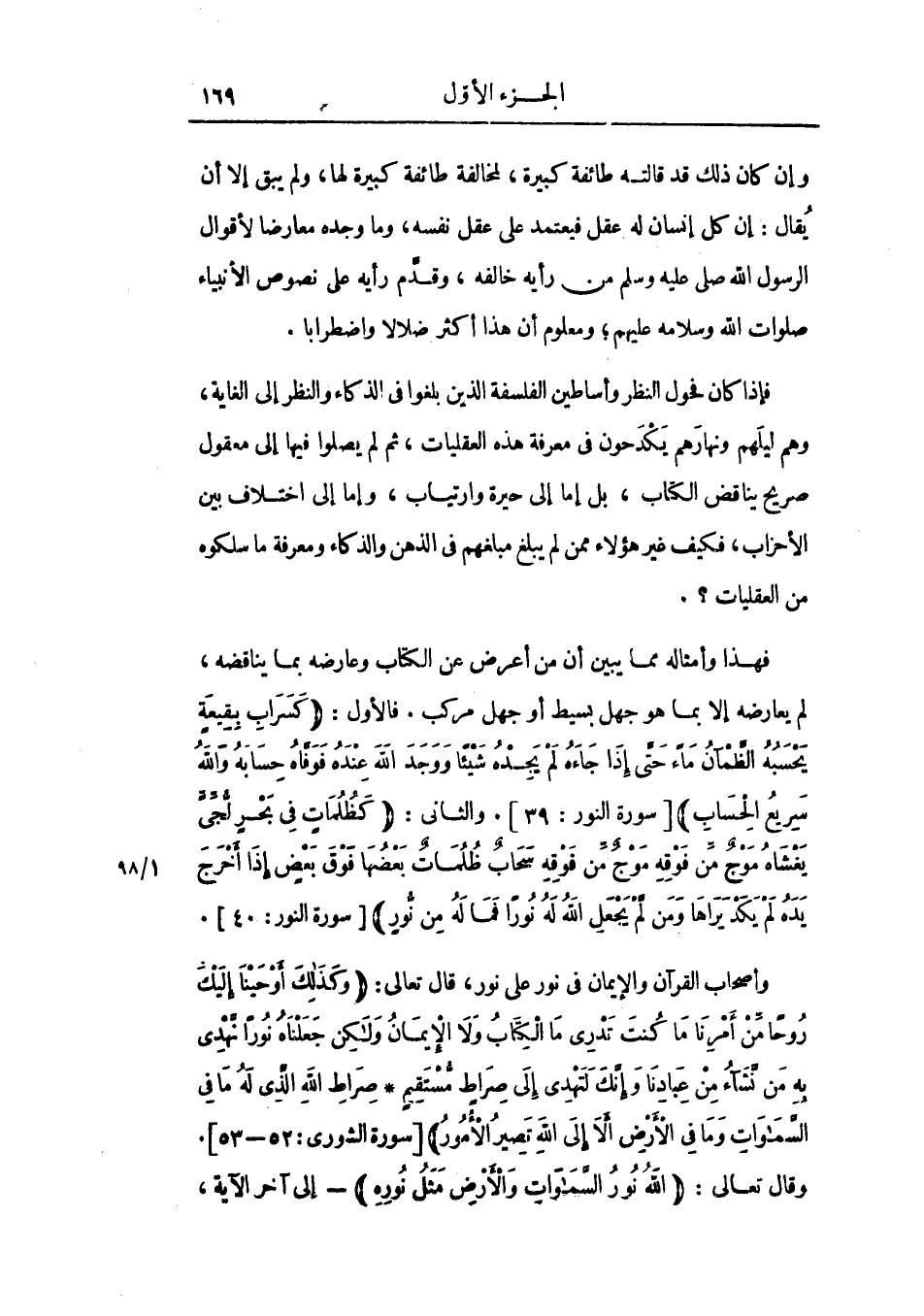 فهذا وأمثاله مما يبين أن من أعرض عن الكتاب وعارضه بما يناقضه، لم يعارضه إلا بما هو جهل بسيط أو جهل مركب فالأول {كسراب بقيعة يحسبه الظمآن ماء حتى إذا جاءه لم يجده شيئا ووجد الله عنده فوفاه حسابه والله سريع الحساب} [النور: 39] والثاني {كظلمات في بحر لجي يغشاه موج من فوقه موج من فوقه سحاب ظلمات بعضها فوق بعض إذا أخرج يده لم يكد يراها ومن لم يجعل الله له نورا فما له من نور} [النور: 40] وأصحاب القرآن والإيمان في نور علي نور، قال تعالي {وكذلك أوحينا إليك روحا من أمرنا ما كنت تدري ما الكتاب ولا الإيمان ولكن جعلناه نورا نهدي به من نشاء من عبادنا وإنك لتهدي إلى صراط مستقيم * صراط الله الذي له ما في السماوات وما في الأرض ألا إلى الله تصير الأمور} [الشوري: 52-53] وقال تعالي {الله نور السماوات والأرض مثل نوره} ـ إلي آخر الآية،